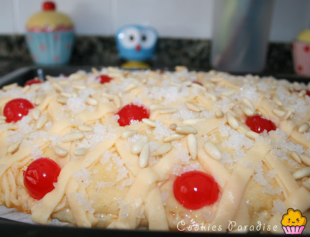 Ponemos la mantequilla, los huevos y el azúcar en un bol hasta que este cremosa, seguido añadimos la sal, y la ralladura del limón. Por otro lado templamos un poco la leche le añadimos la levadura de panadería y disolvemos bien, cuando este disuelta la añadimos al bol. Por último añadimos la harina a cucharadas, cuando estye completamente integrado y ha doblado su volumen lo tapamos y dejamos reposar hasta que haya triplicado su volumen. Mientras podemos preparar la crema. Cuando tenemos la masa y la crema preparada, precalentamos el horno a 170º cojemos la masa (pegajosa) espolvoreamos la encimera y la masa con un poco de harina para que no se nos pegue. Amasamos un poco, medio minuto, lo suficiente para sacar el aire, partimos en 2 y le damos forma ovalada con las manos, con un rodillo de 6 milimetros aprox amasamos (entre papel vegetal irá mejor) hacemos las dos pates igual, coloco una parte en la bandeja del horno y decoro por encima con la crema, cubro con la otra parte y dejo reposar tapada en el horno a unos 40º una hora aprox, Entonces pinto con cuidado con huevo, decoro con crema con una boquilla lisa y añafo los piñones, guindas y el azúcar humedecido con un poco de agua. Horneamos unos 30 min hasta que tenga color 🙂