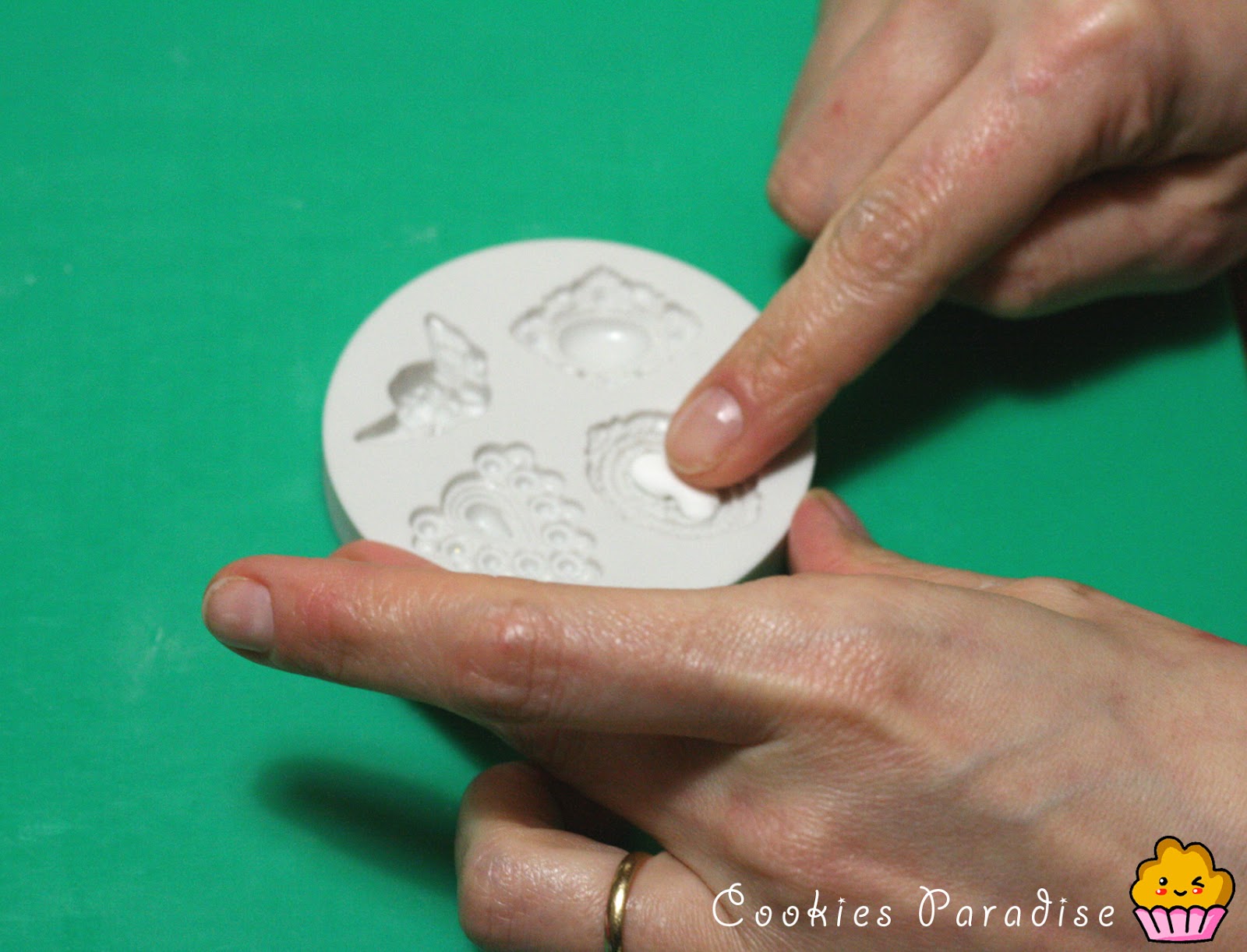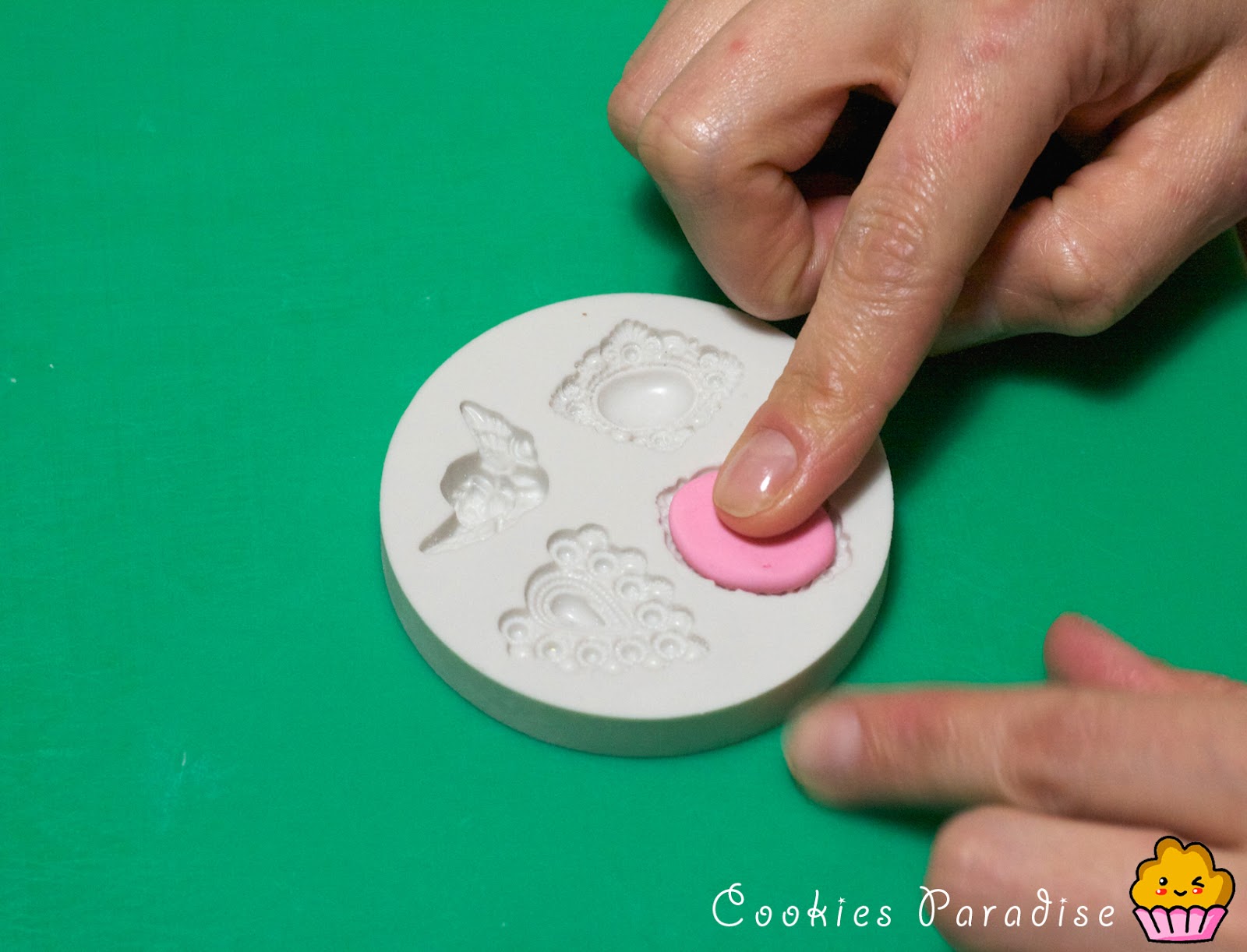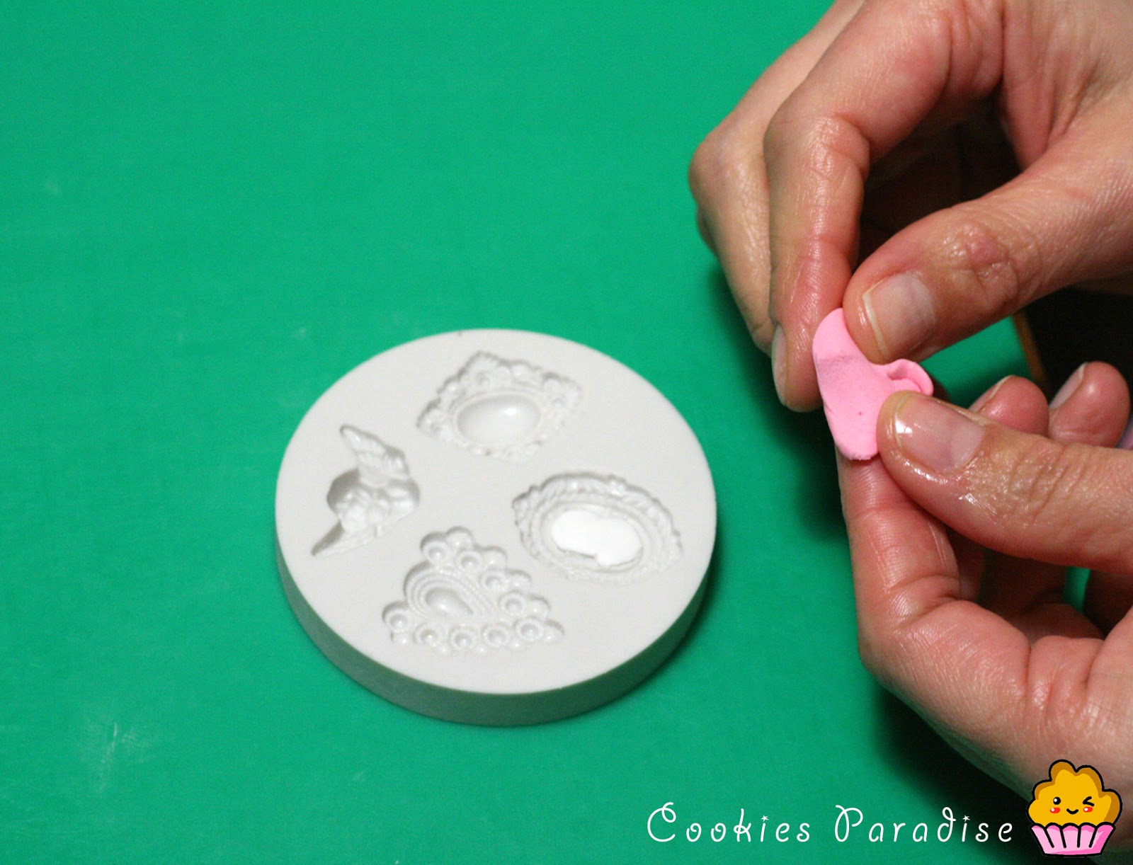 Para el camafeo cojemos un poco de fondant blanco y lo ponemos encima de la cara de la dama.