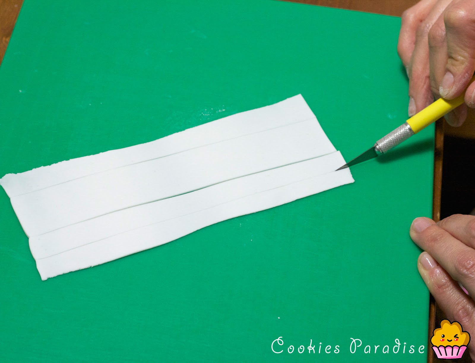 Estiramos pasta de goma de color blanco y con la ayuda de un bisturí o similar recortamos un rectángulo aproximadamente de 2 cm por 14 cm.