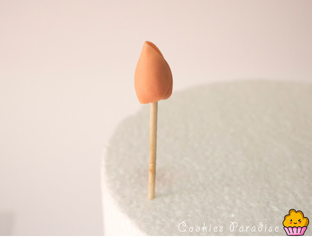 Paso 1: Cojemos un palillo, le cortamos la punta con unas tijeras para que no rompa el fondant al pincharlo y clavamos una bolita en forma ovalada en el.