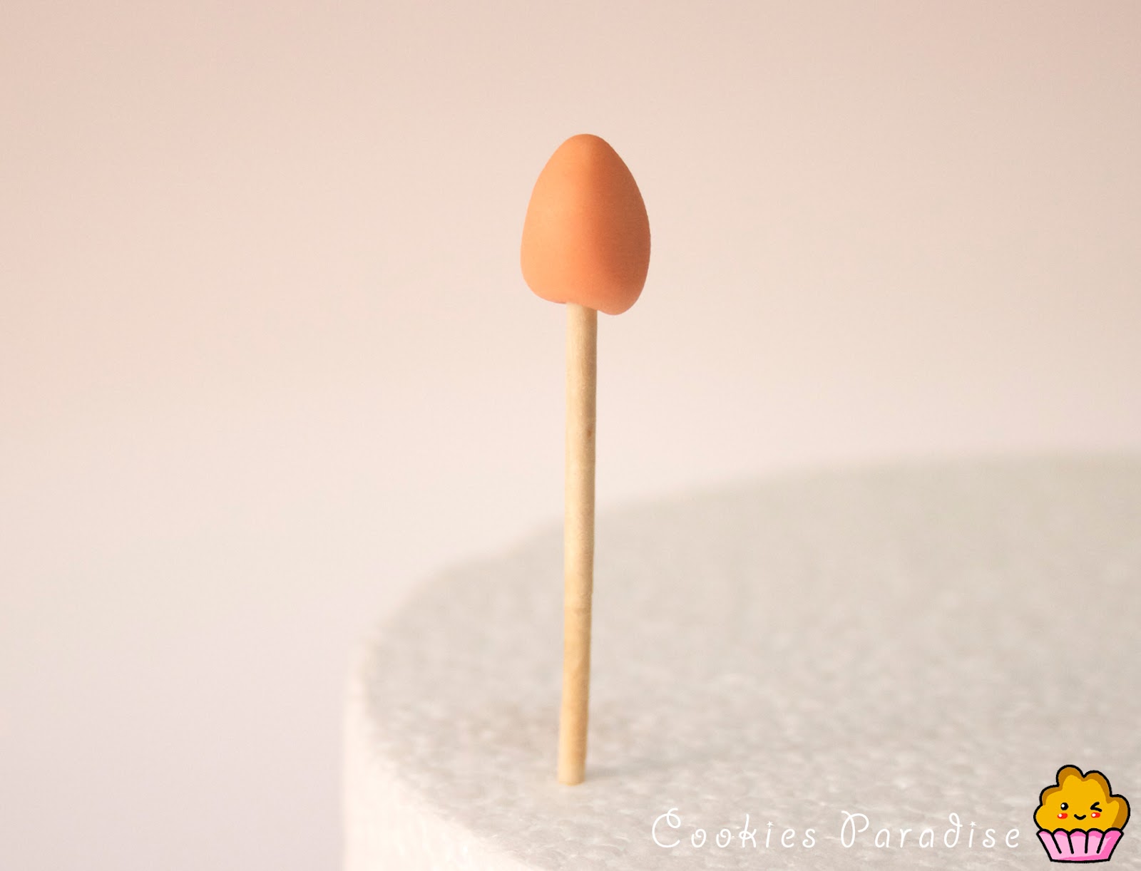 Paso 1: Cojemos un palillo, le cortamos la punta con unas tijeras para que no rompa el fondant al pincharlo y clavamos una bolita en forma ovalada en el.
