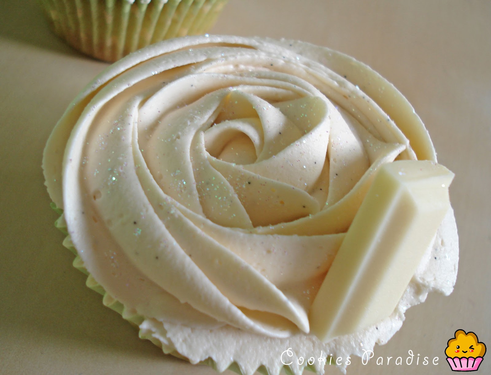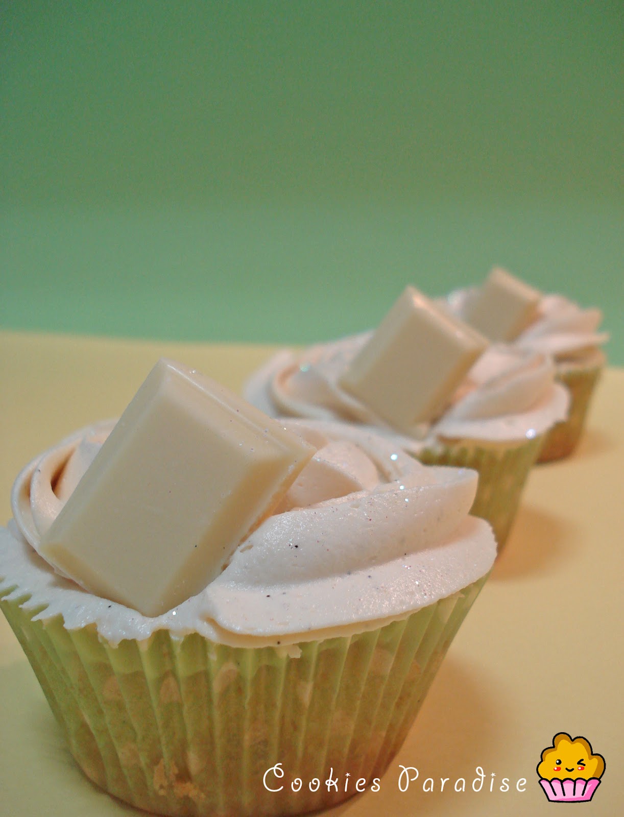 Los cupcakes son de vainilla, usé mi receta favorita,  pero esta vez añadí 75 gr de chips de chocolate blanco a la masa y 75 gr al buttercream que había desecho antes al baño maría (hay que dejarlo enfriar antes de añadir al butercream) … Decoré con laster dust (purpurina comestible)  y un trocito de chocolate blanco.