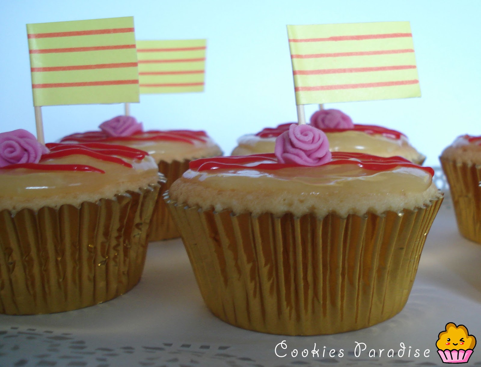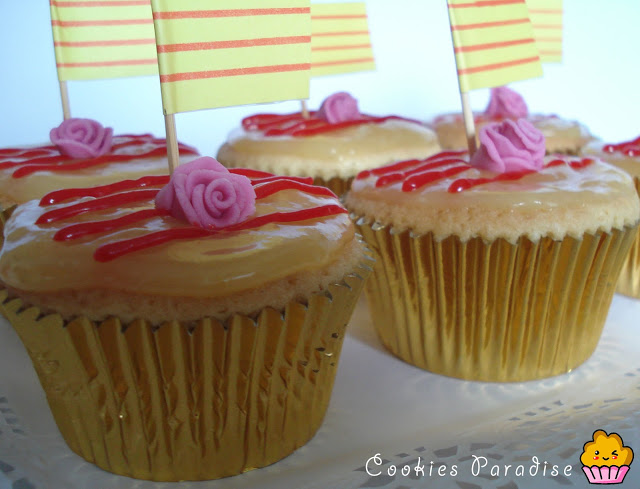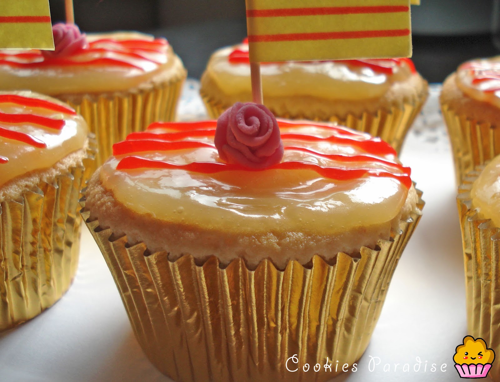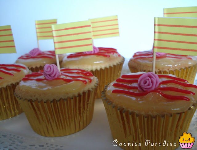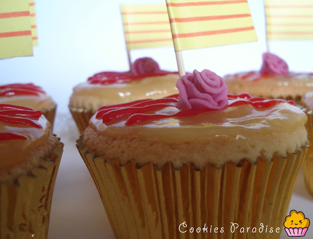 Decoración: Vertemos un poco de crema de limón encima del cupcake con cuidado que no se caiga por los bordes, pintamos con un poco de crema que hemos coloreado con colorante rojo las 4 lineas de catalunya, pinchamos la banderita y colocamos la rosa que hemos hecho con fondant.