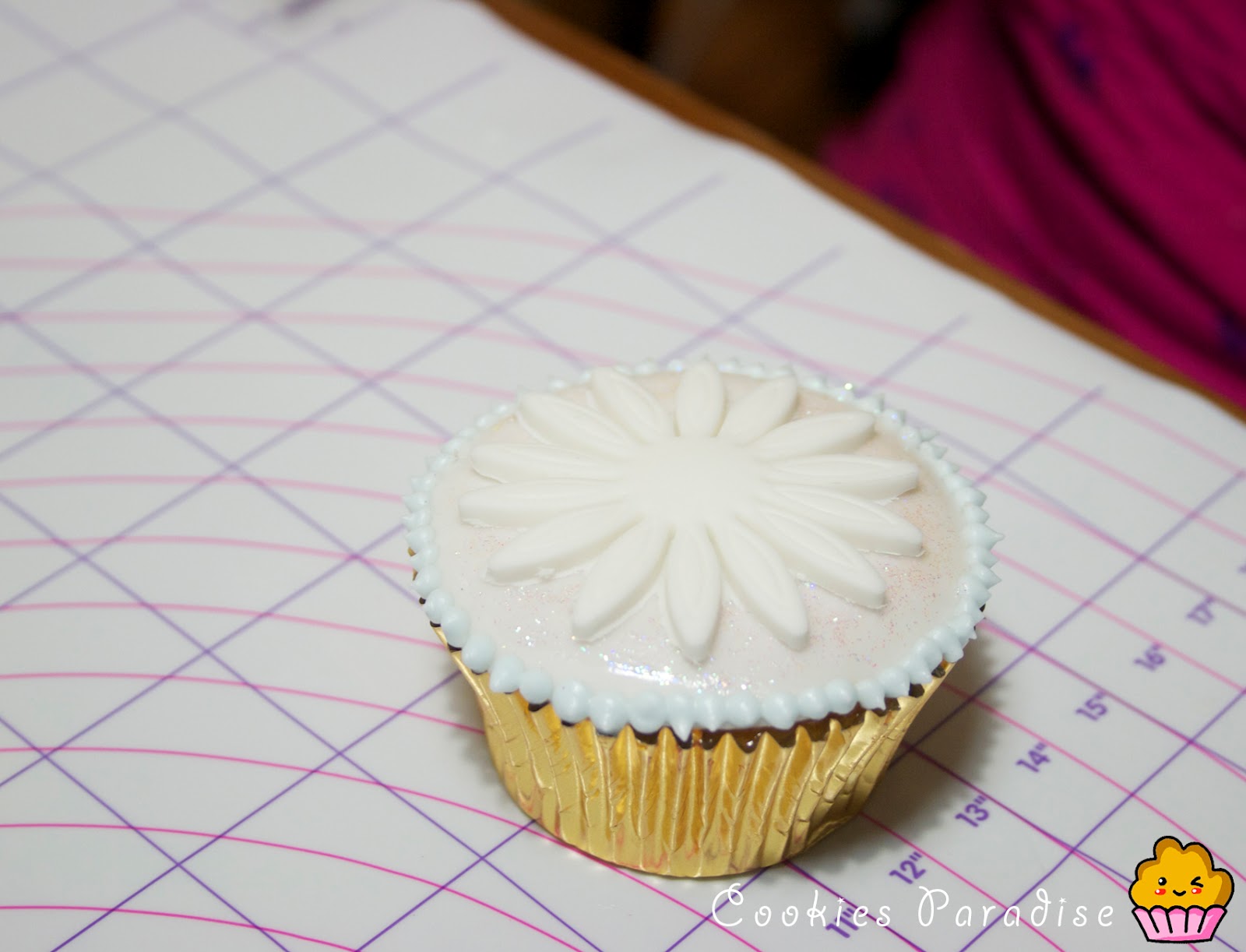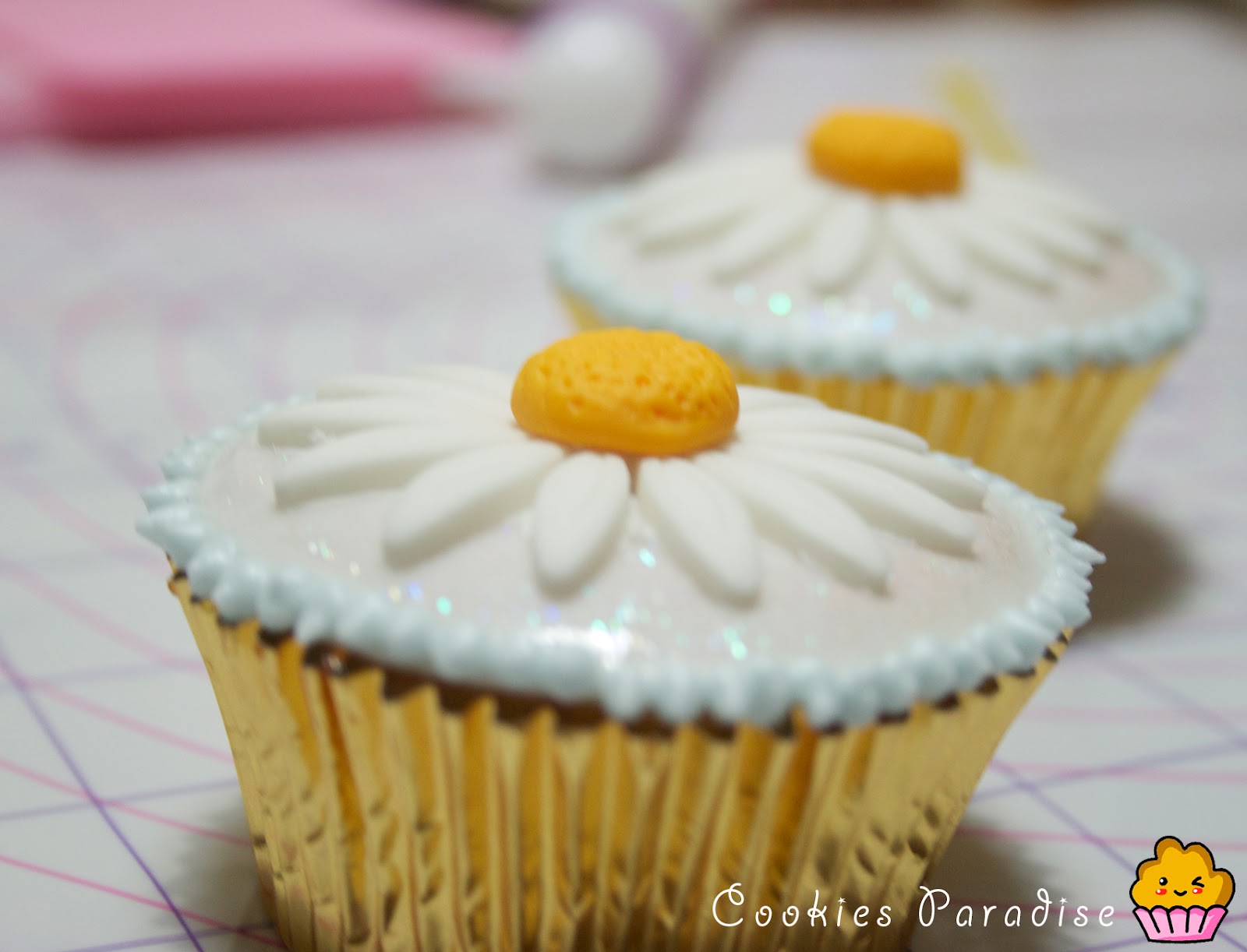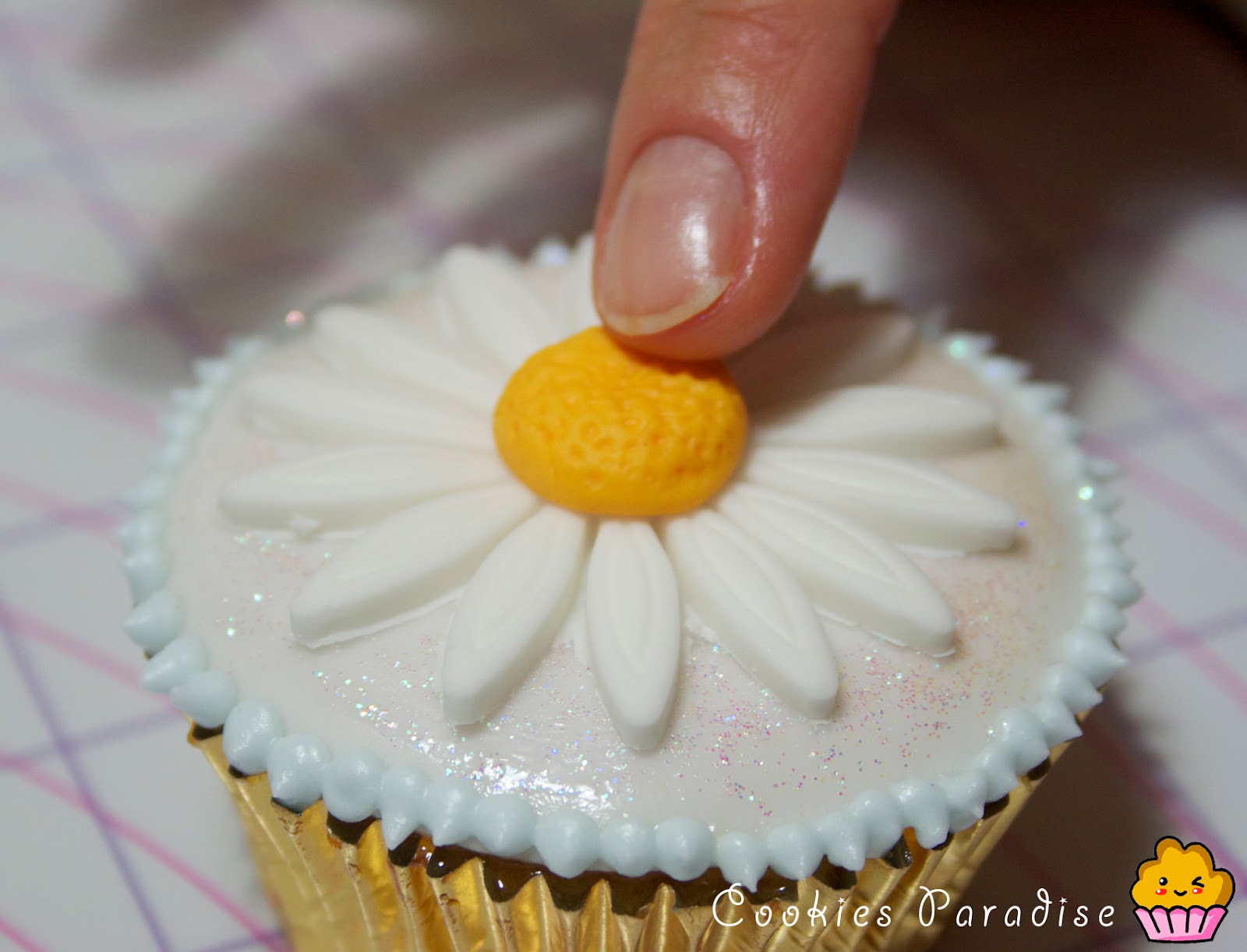 Paso a paso con imagenes de cómo decorar unos cupcakes con fondant y margarita.