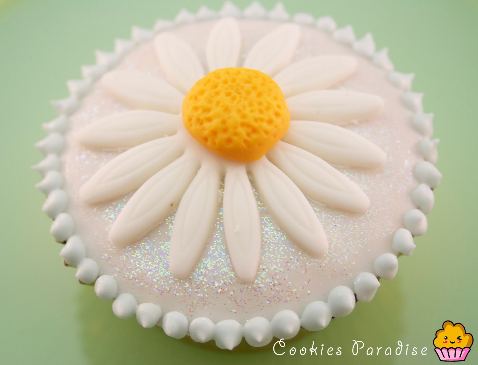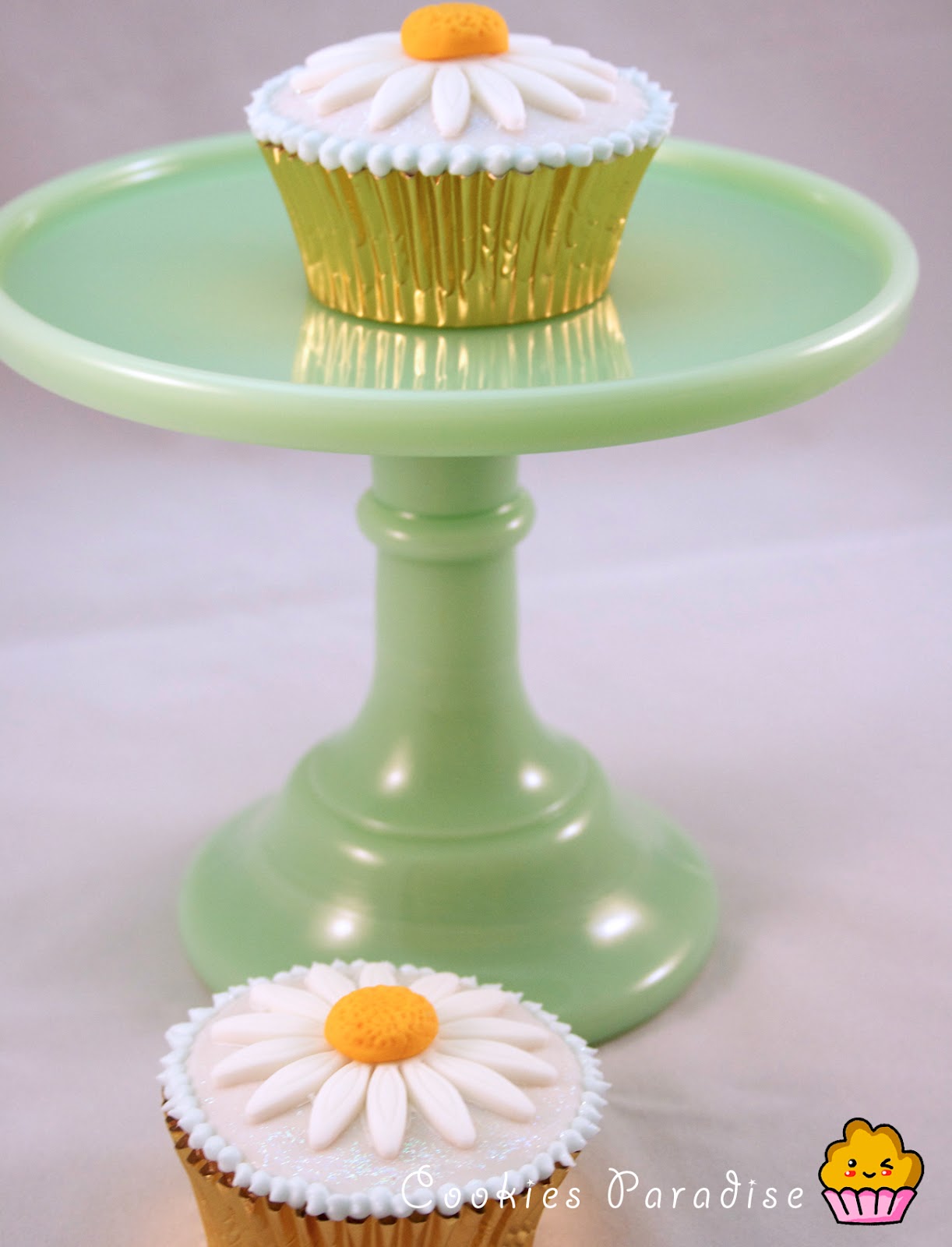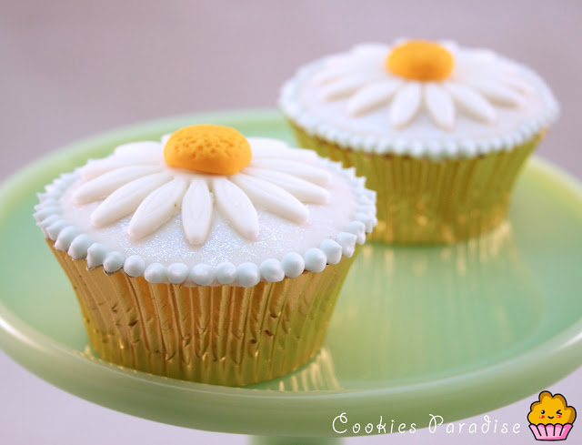 Paso a paso con imagenes de cómo decorar unos cupcakes con fondant y margarita.