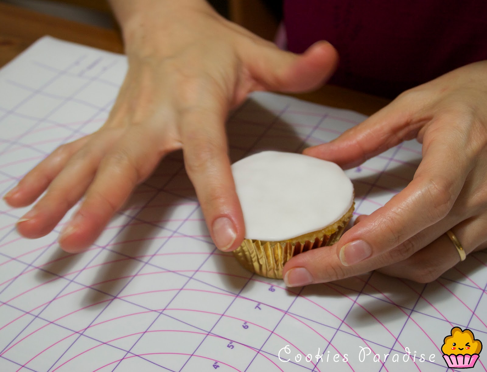 Colocamos con cuidado el circulo de fondant encima del cupcake, realizamos toques suaves con nuestros dedos también podemos ayudarnos con un alisador de tartas si lo tenemos, de este modo lo dejaremos bien liso y nos quedará bien fijado al cupcake.