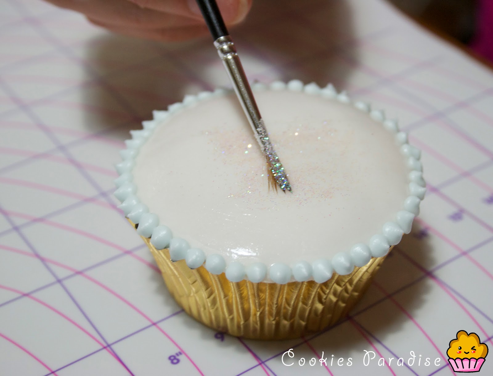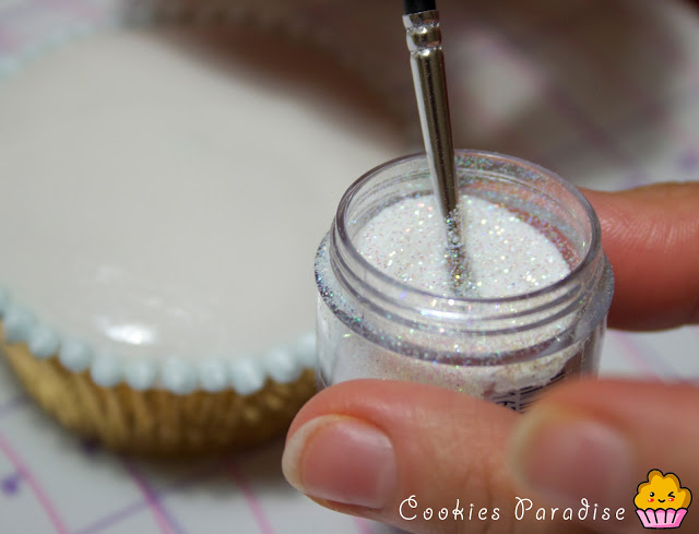 Cuando terminamos con la glasa cojemos un pincel pequeño y lo húmedecemos un poco y pintamos la parte superior del cupcake esto serbirá para que se pegue la purpurina.