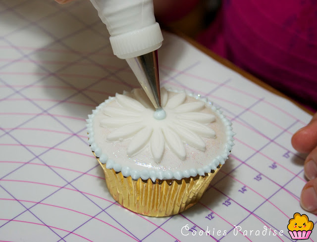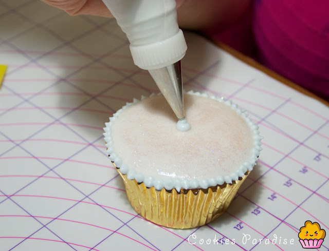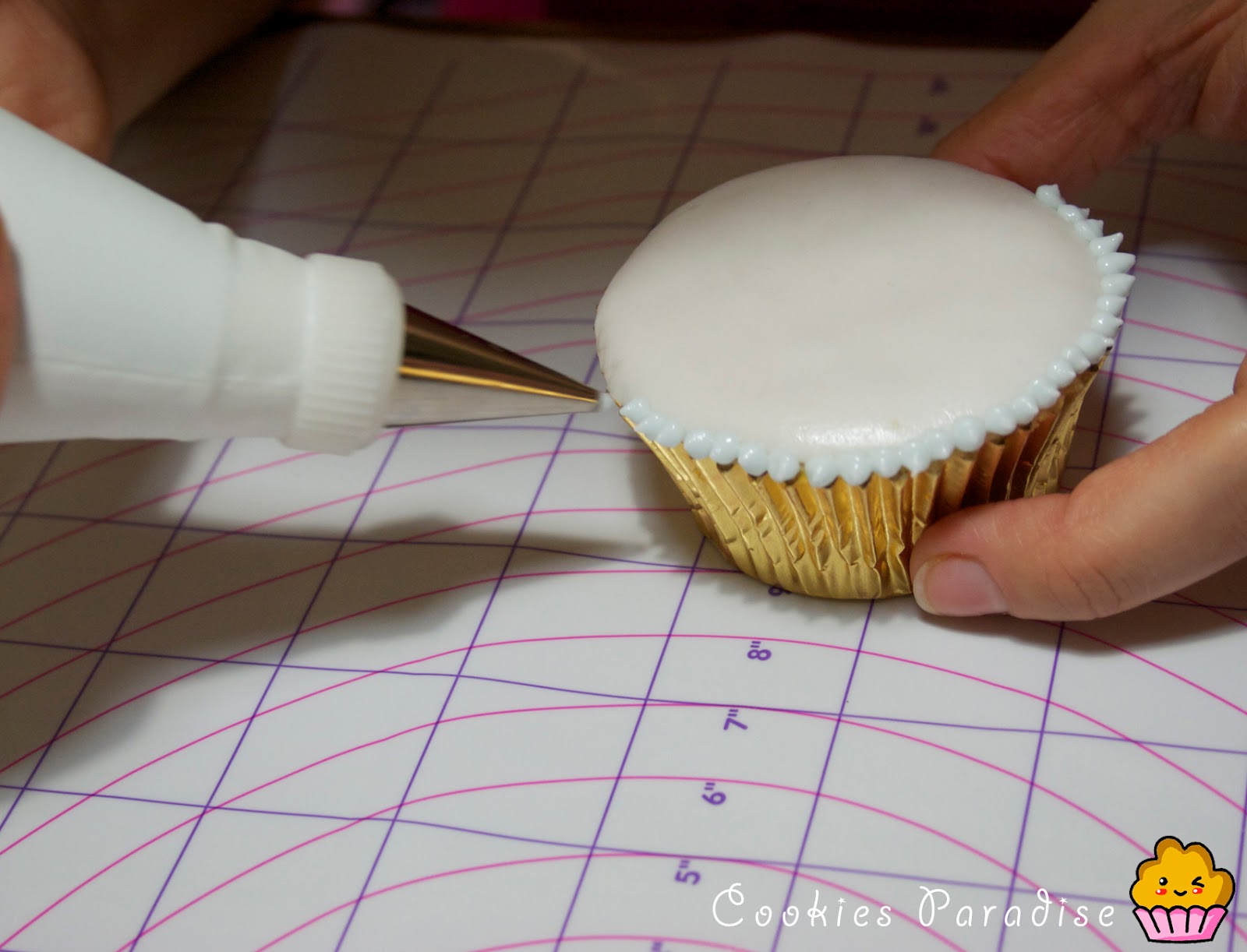 Para los detalles usaremos un poco de glaseado, con una boquilla finita iremos haciendo bolitas pequeñitas por todo alrededor para disimular la terminación del fondant en el cupcake.
