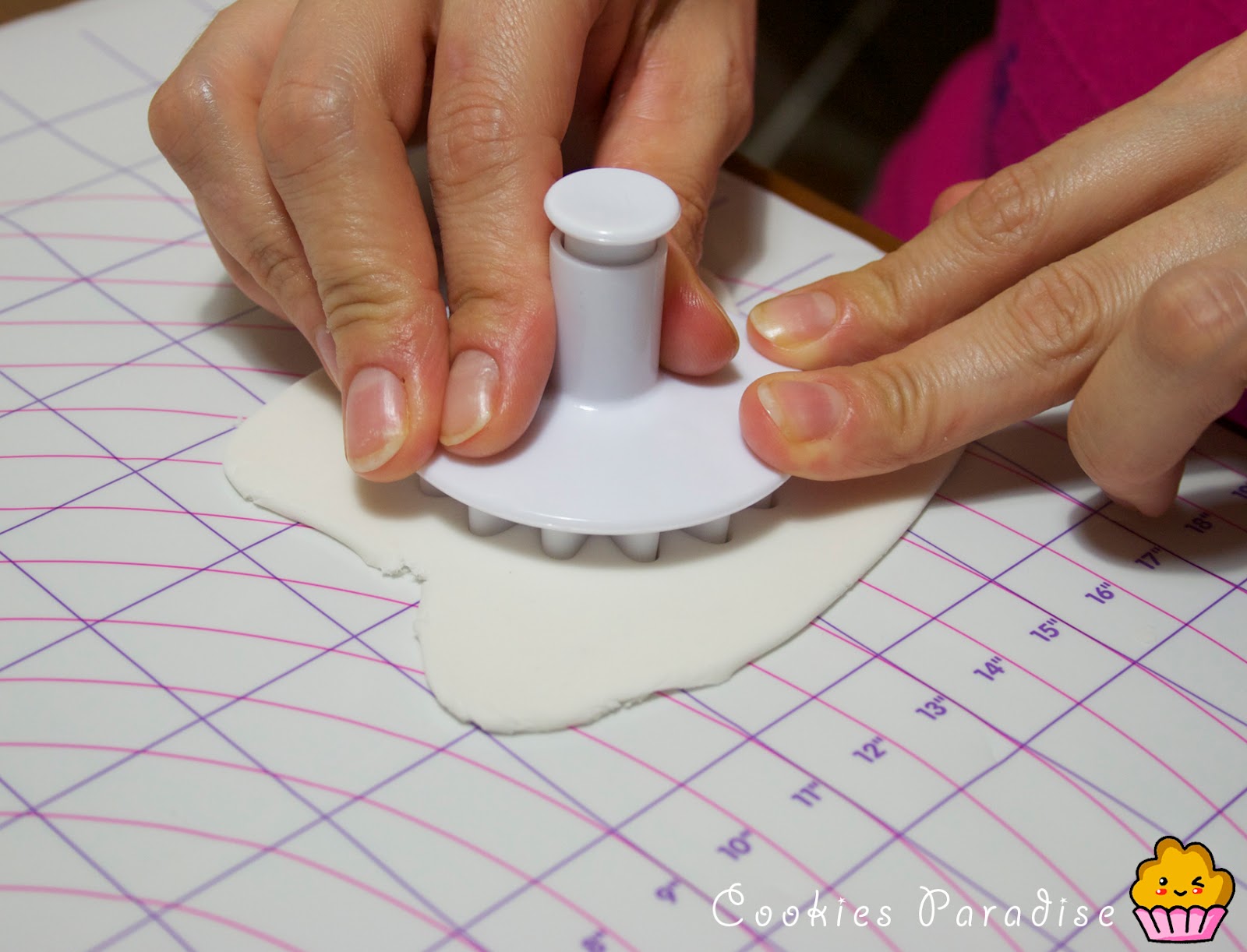 Cuando terminemos con la purpurina cojeremos un poco más de fondant lo ablandamo con las manos y hacemos una margarita con un cortador expulsor o similar.