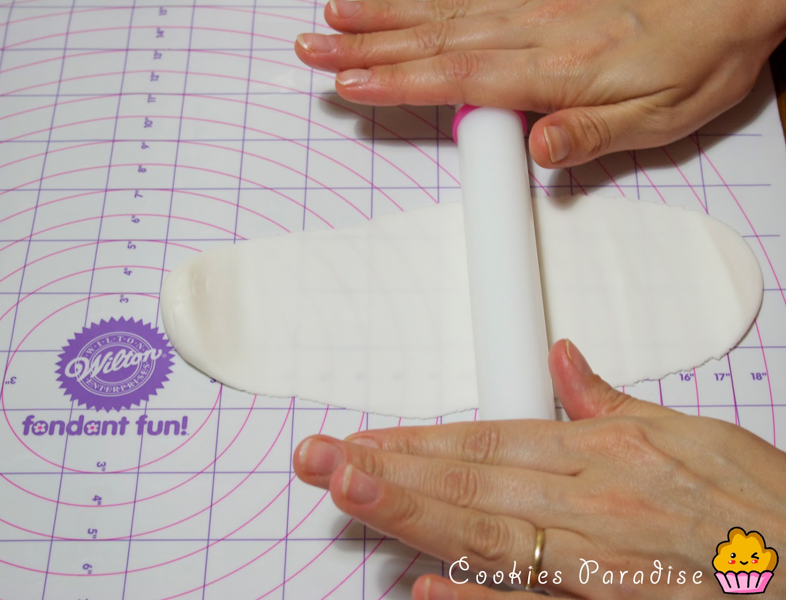Primero trabajamos un poco el fondant para ablandarlo, (si tenemos cisco podemos usarlo) despúes estiramos el fondat con un rodillo (yo no lo he coloreado porque lo quería blanco) si lo quereís de otro color o aprovechar un fondant que tengaís coloreado también sirbe.