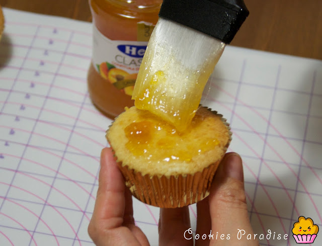 Lo primero que tenemos que hacer es pintar con un pincel de silicona o cocina nuestro cupcake, yo lo he pintado con mermelada, lo podeís hacer con dulce de leche, nocilla, ganache….lo que tengaís esto serbirá para que el fondant que pongamos encima quede fijado.
