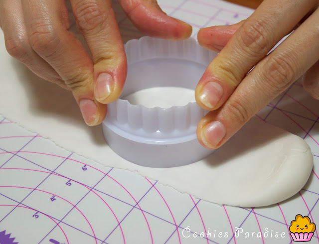 Una vez ya tenemos nuestro fondant liso, cortamos un circulo con un cortador de galletas o (algo similar ) del mismo diametro que nuestro cupcake .