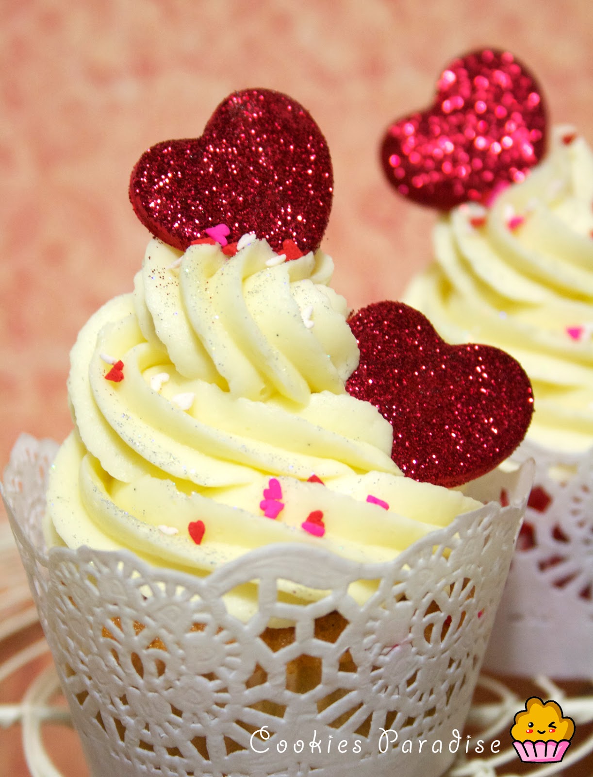 Pintamos los corazones con un pincel y un poco de agua, los colocamos encima de un folio y espolvoreamos con purpurina comestible, despúes volvemos a poner la púrpurina en el bote. Ahora colocamos el corazón con cuidado, encima del cupcake (tumbadito) que queda más mono y vamos a por el cubre cápsula!!