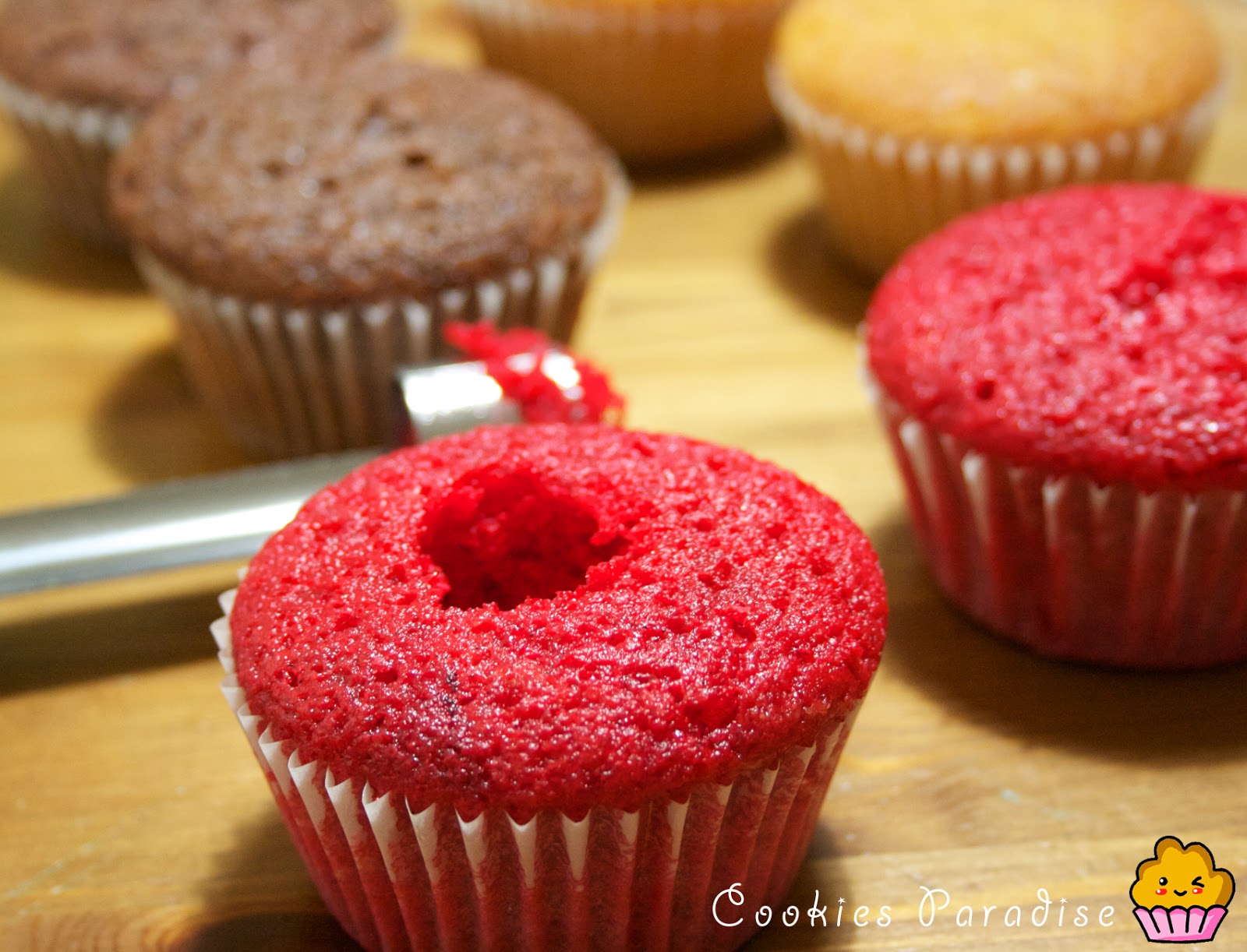 Ah!! si teneís colorante en pasta y quereís los cupcakes rojos sólo teneís que teñir la masa antes de hornearlos.