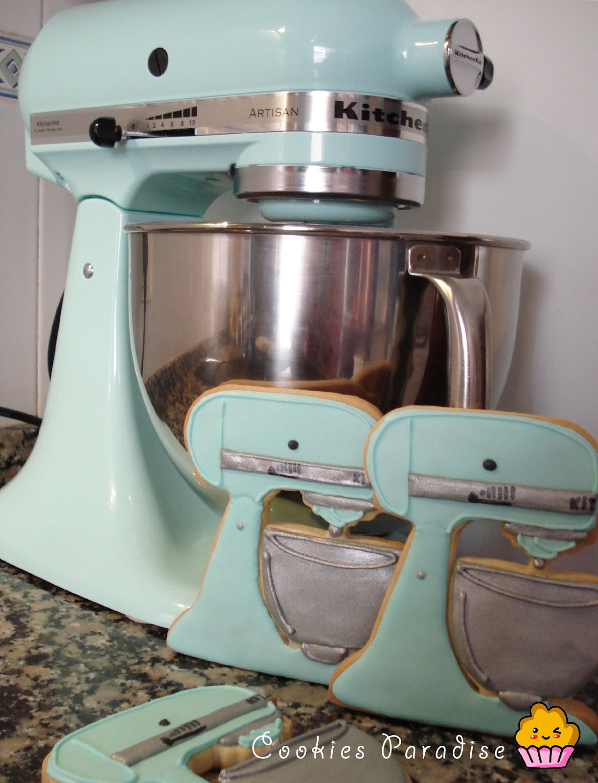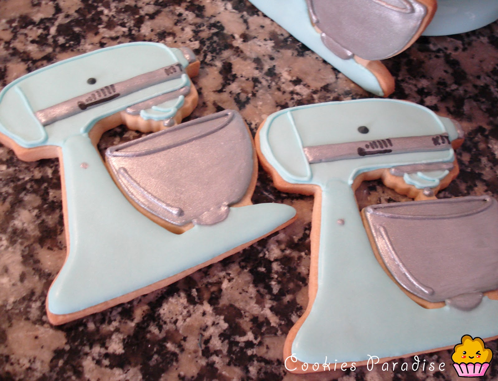 Y como os dije ayer estos dias he horneado varias veces galletas, aproveche y recorte 4 galletas en forma de kitchenaid para probarlo, para decorarlas use colorantes americolor, para conseguir el turquesa clarito de mi kitchenaid usé el turquesa de americolor (muy poco, coji un poco con un palillo, hasta que obtube el color) y gris para el bol y el resto de decoración, cuando se secó lo terminé de decorar con duster dust silver, en un platito puse unas gotas de vodka e iba mojando el pincel en el bodka y en los polvos «luster dust» para realizar el acabado plateado de la galleta, para terminar con rotulador negro comestibles de americolor, dibuje el resto. Os gustan? os dejo una foto cuando estaba cortando las galletas en la masa, otra recién horneadas ya dentro de su taper…y las otras terminadas al lado de mi KA!