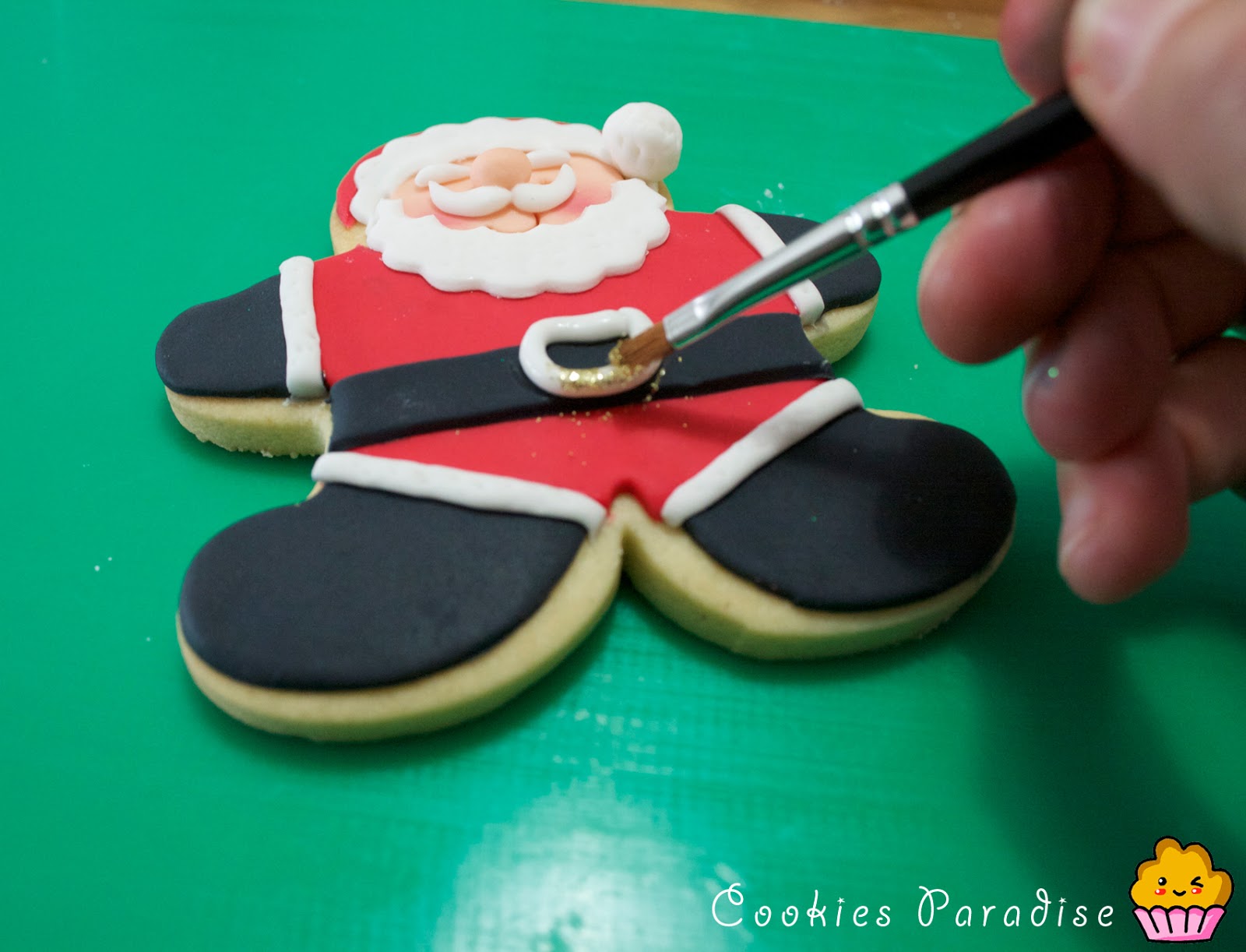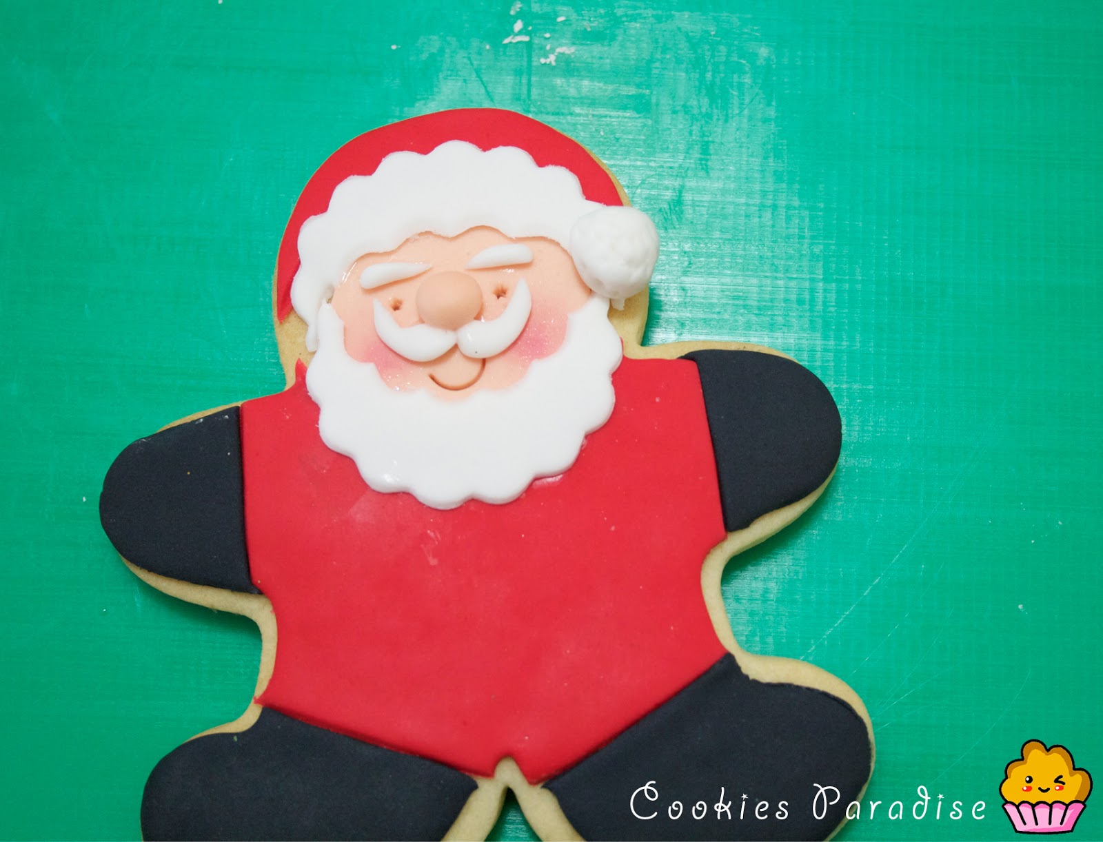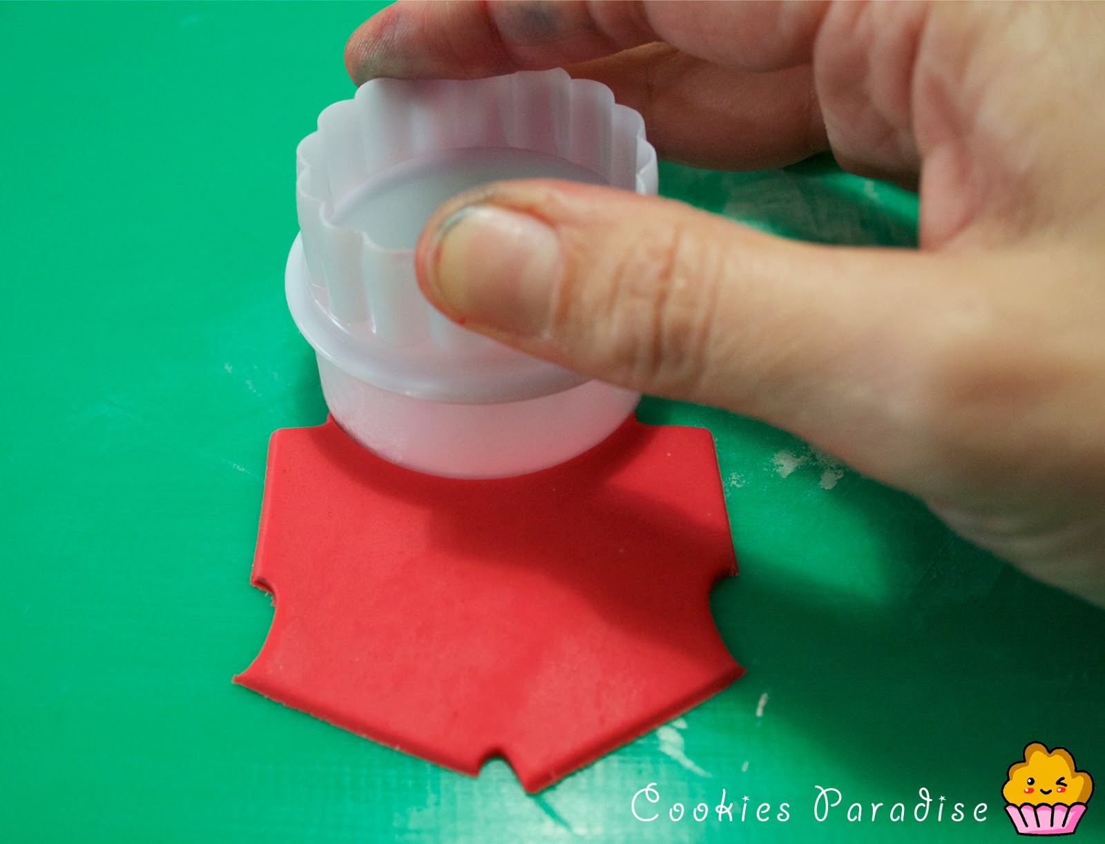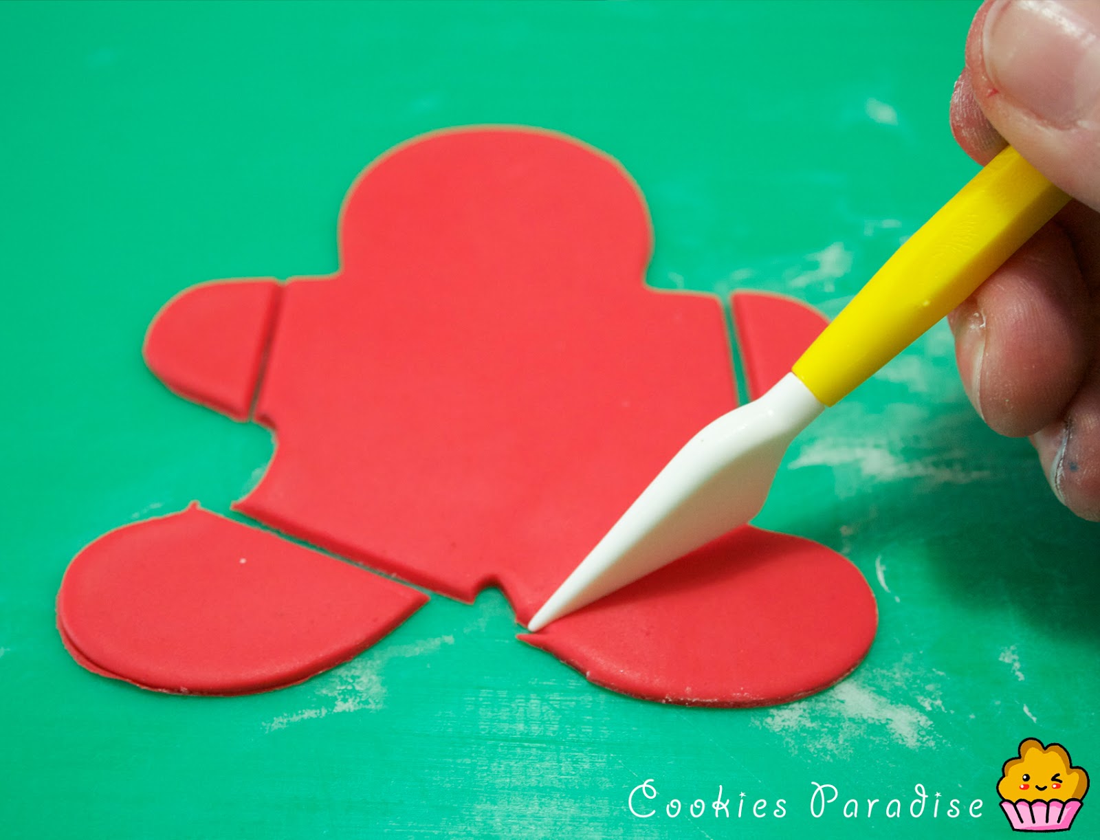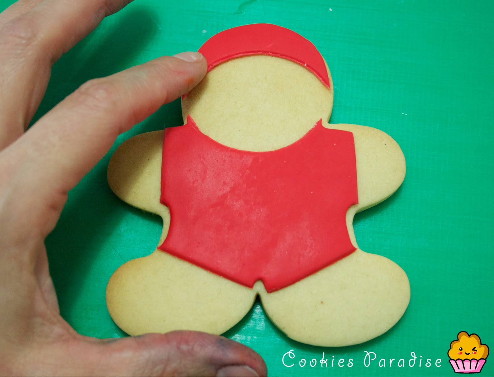 Cortaremos una pieza con el cortador de rojo, ya tenemos la silueta, ahora si queremos hacer las botas y guantes, lo cortaremos del rojo y lo substituiremos por el negro encima de la galleta, vamos allá!!!