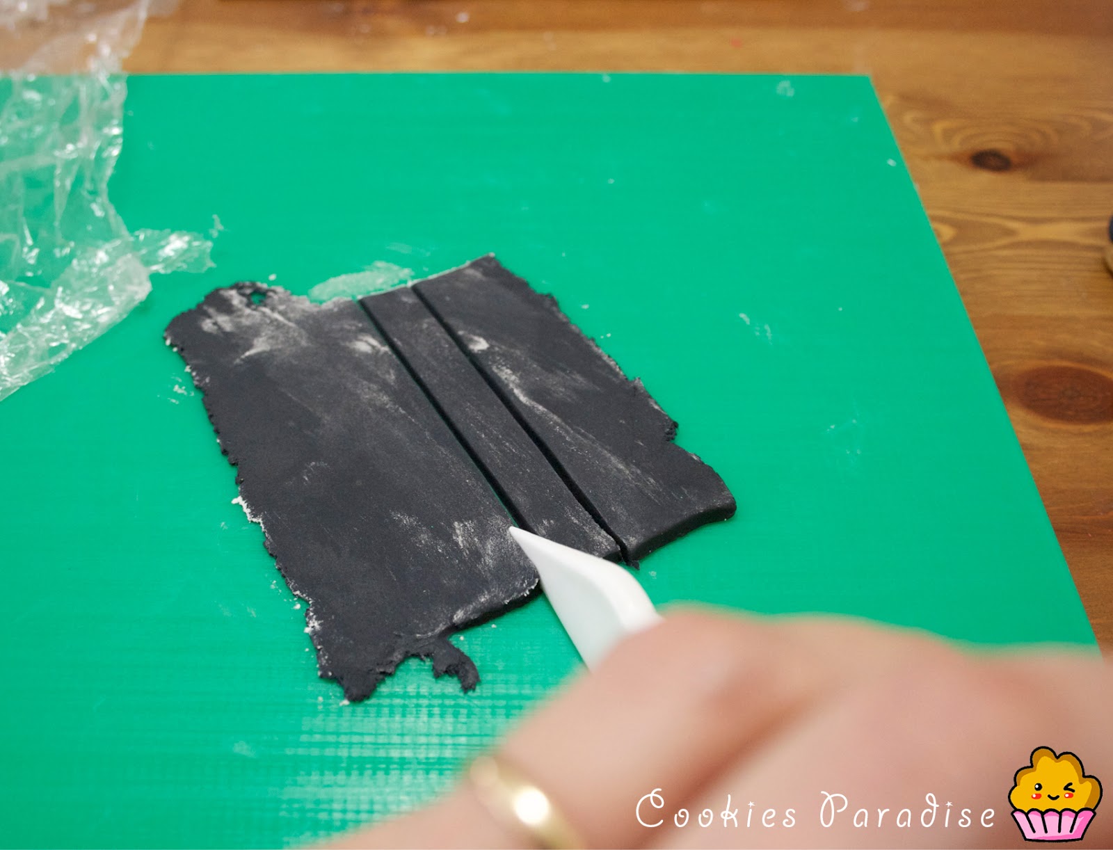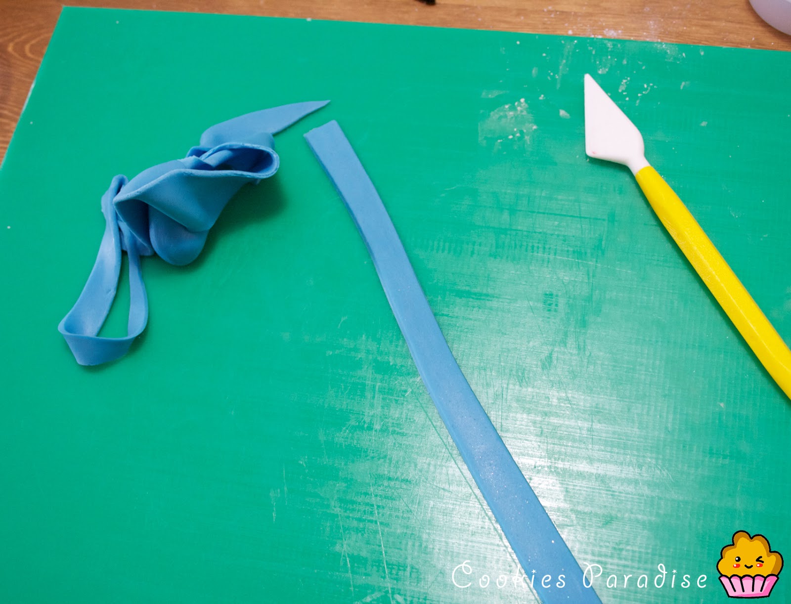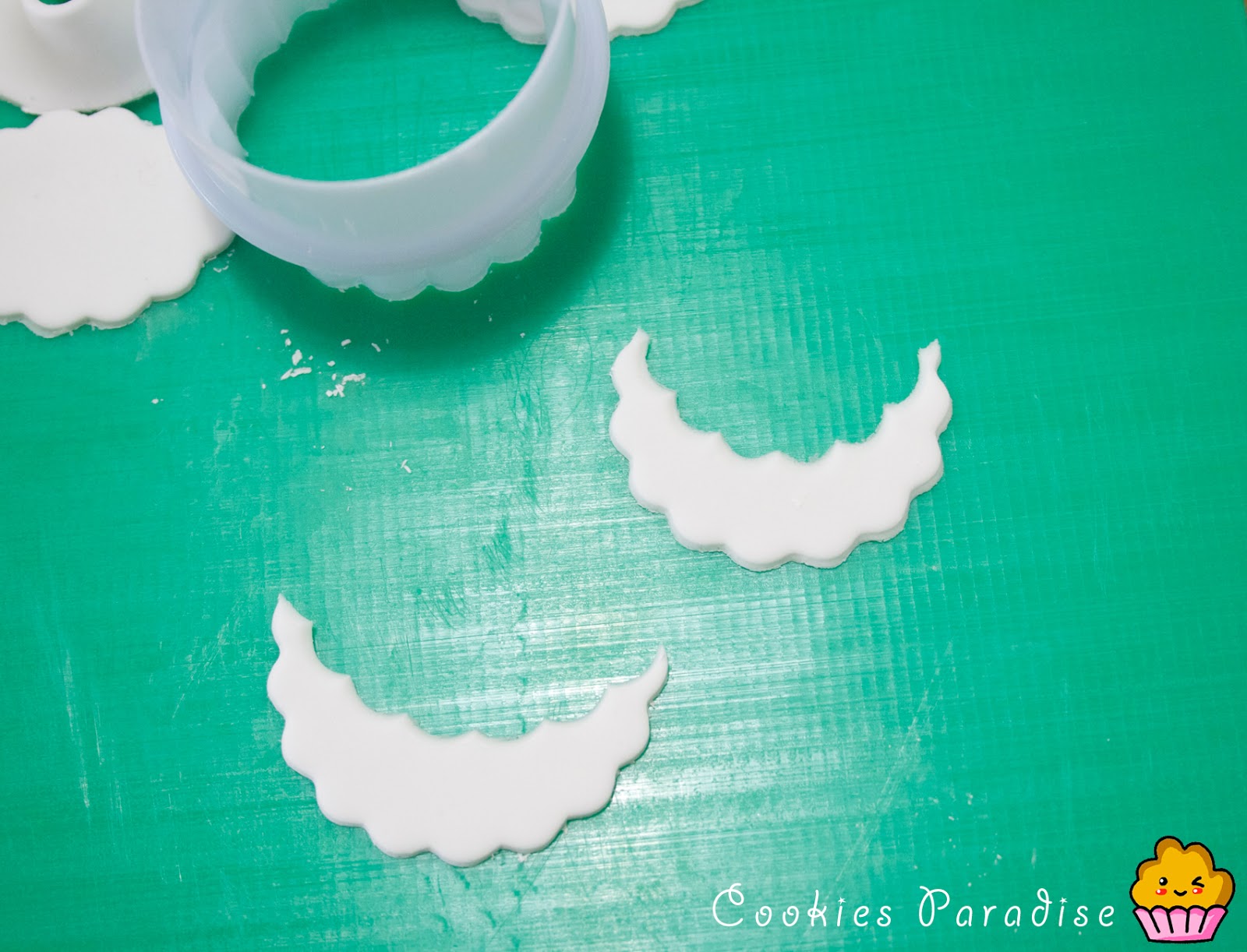 7. Amparo, como lo haces? te cuento como lo hago yo, pongo maicena en la mesa, estiro el fondat finito, pongo maicena por encima del fondant, y con el cortador meneo suavemente de lado a lado hasta que el corte sea perfecto, incluso puedes probar de cortar con un film por encima, aquizás de esta forma te salga como a mi no? ya me cuentas! Besos!