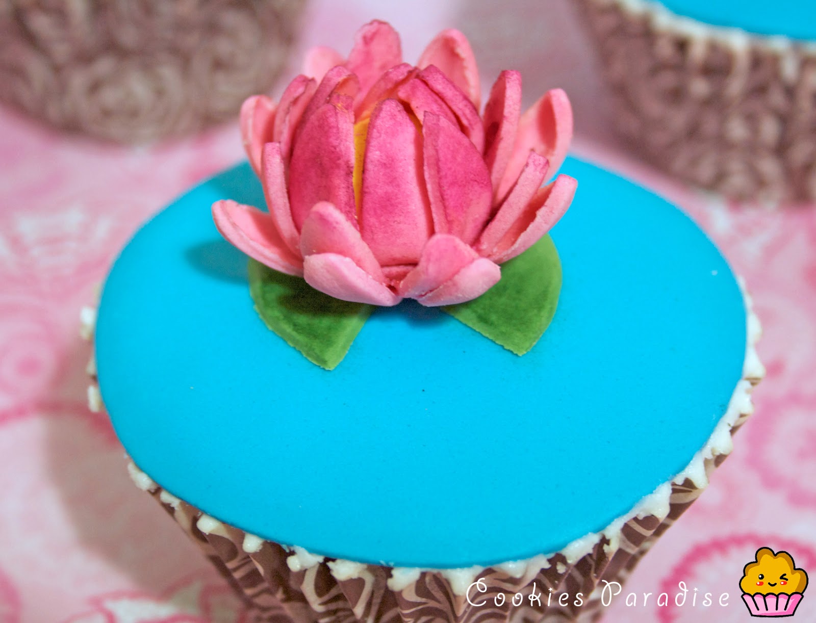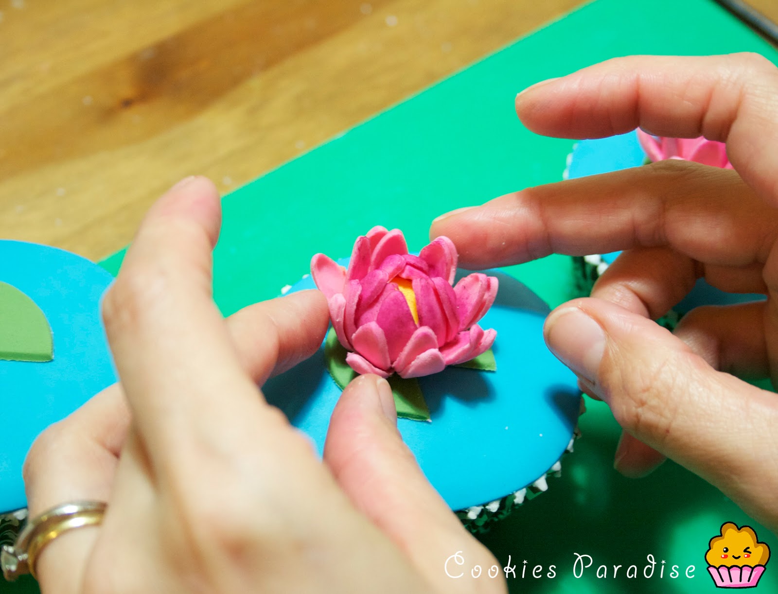 Dicho esto, en este caso los he decorado con fondant. Antes de decorarlos los cubro con una montañita de crema de mantequilla o ganache (esta vez le quedaba la crema de mantequilla vegetal como anillo al dedo) habéis probado los circulo rojo de Bimbo? pues me recuerda mucho a eso!! Tenía tantas ganas de encontrar una receta de chocolate y esa crema….mmmmmm!!!!Pero no se vayan todavía!…..Aún hay más!!!Os voy a enseñar a hacer unos sencillisimos nenúfares!