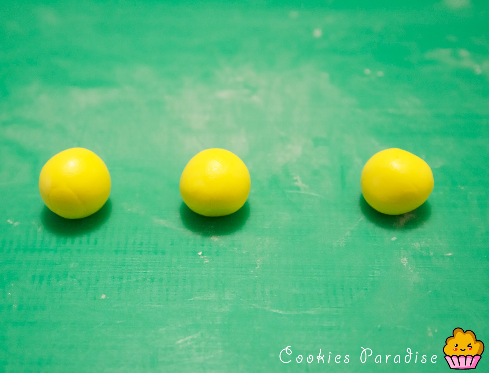 En fondant de color amarillo formaremos 3 bolitas de 1 cm de diámetro aprox. Será el centro de nuestro nenúfar.