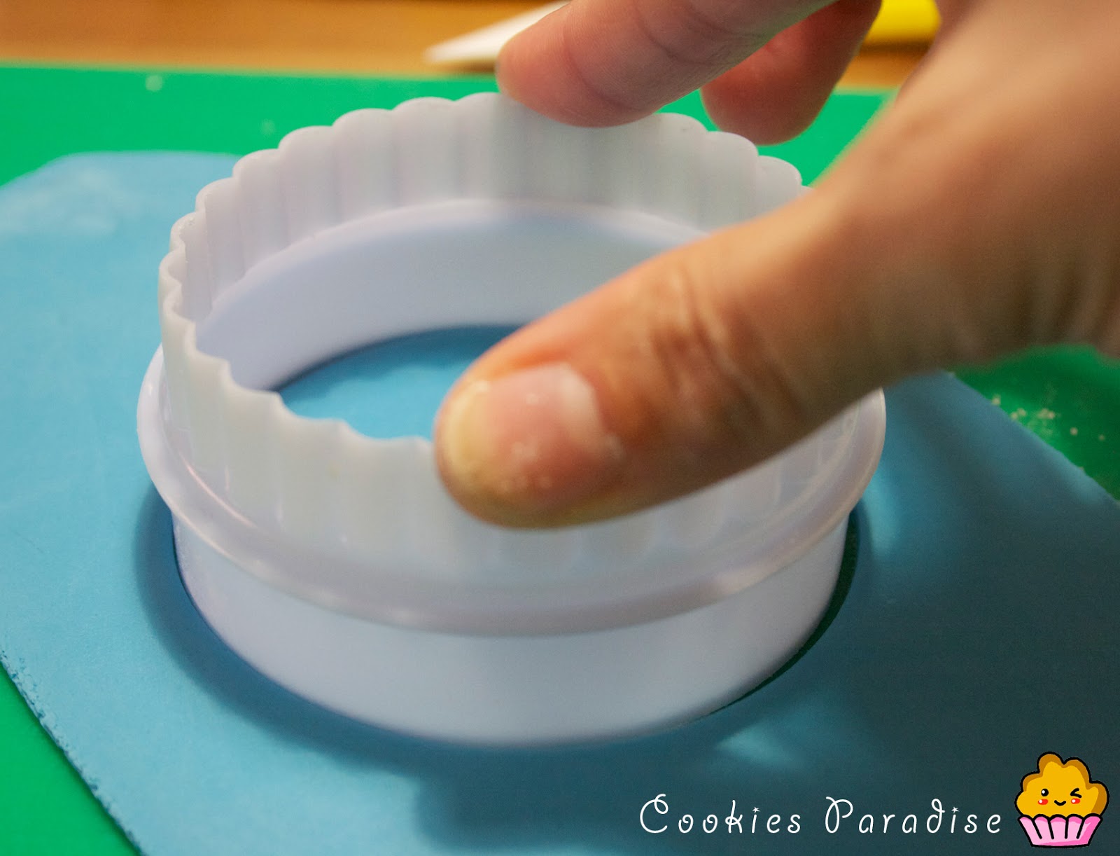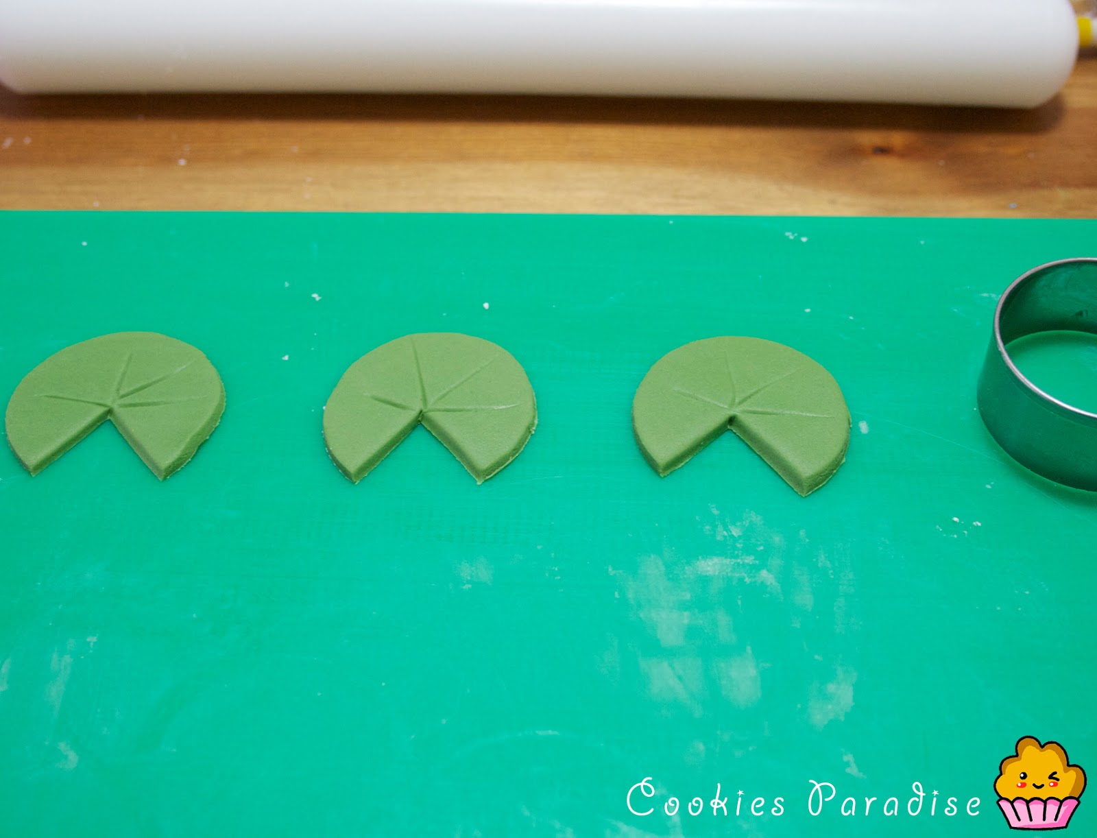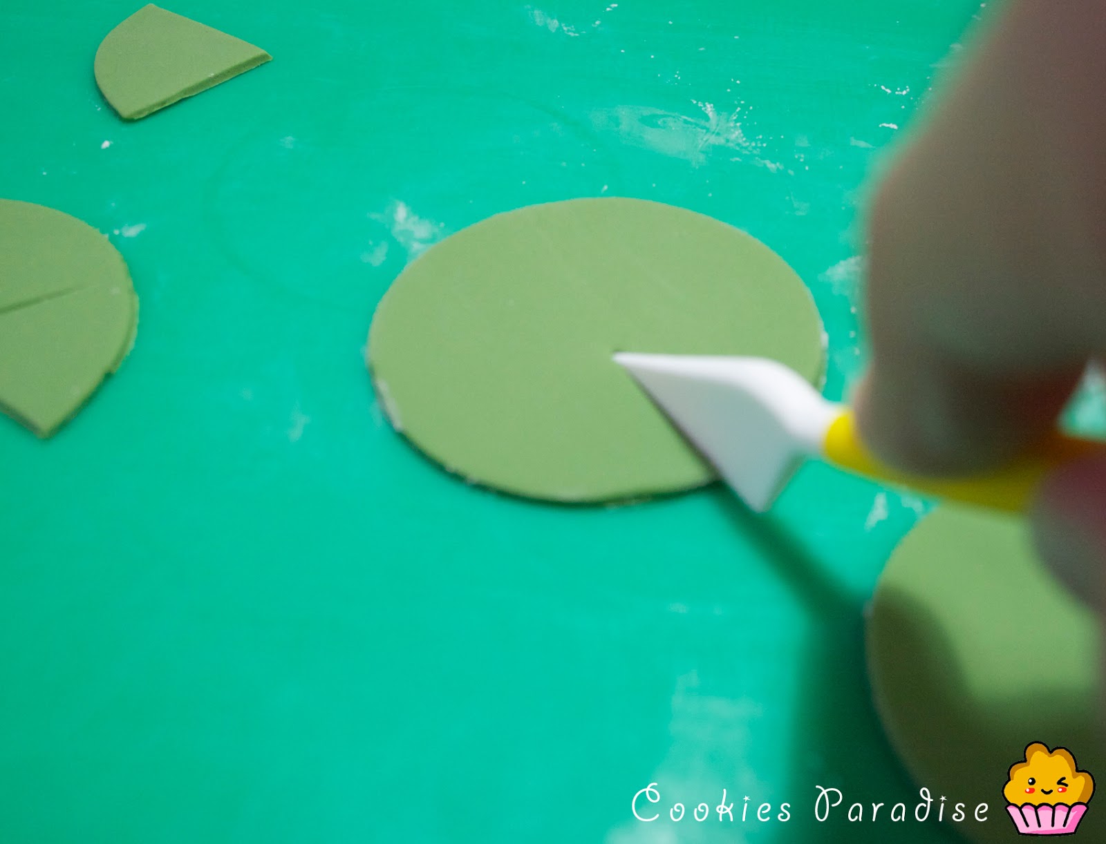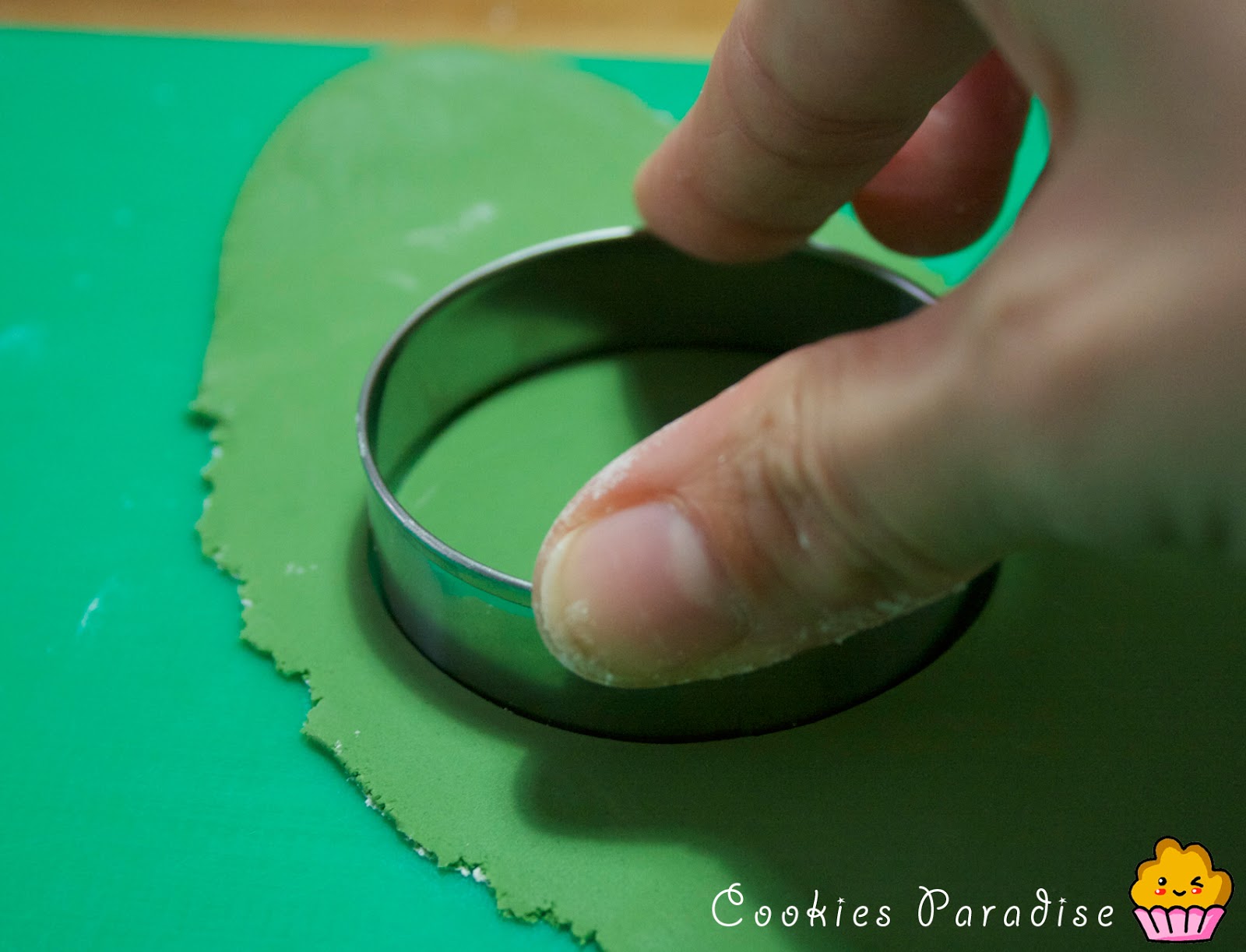 Con fondant de color verde haremos las hojitas, con un cortador de 4 cm de diámetro aprox. recortamos los círculos.