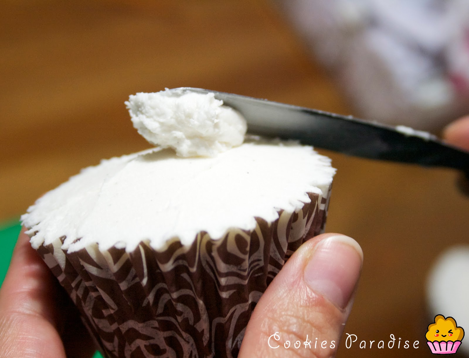 Cubrimos con la ayuda de una espátula con crema de mantequilla el cupcake. Como no los quería muy altos no le puse mucha cantidad de crema, si los queréis más redonditos…. le ponéis más.