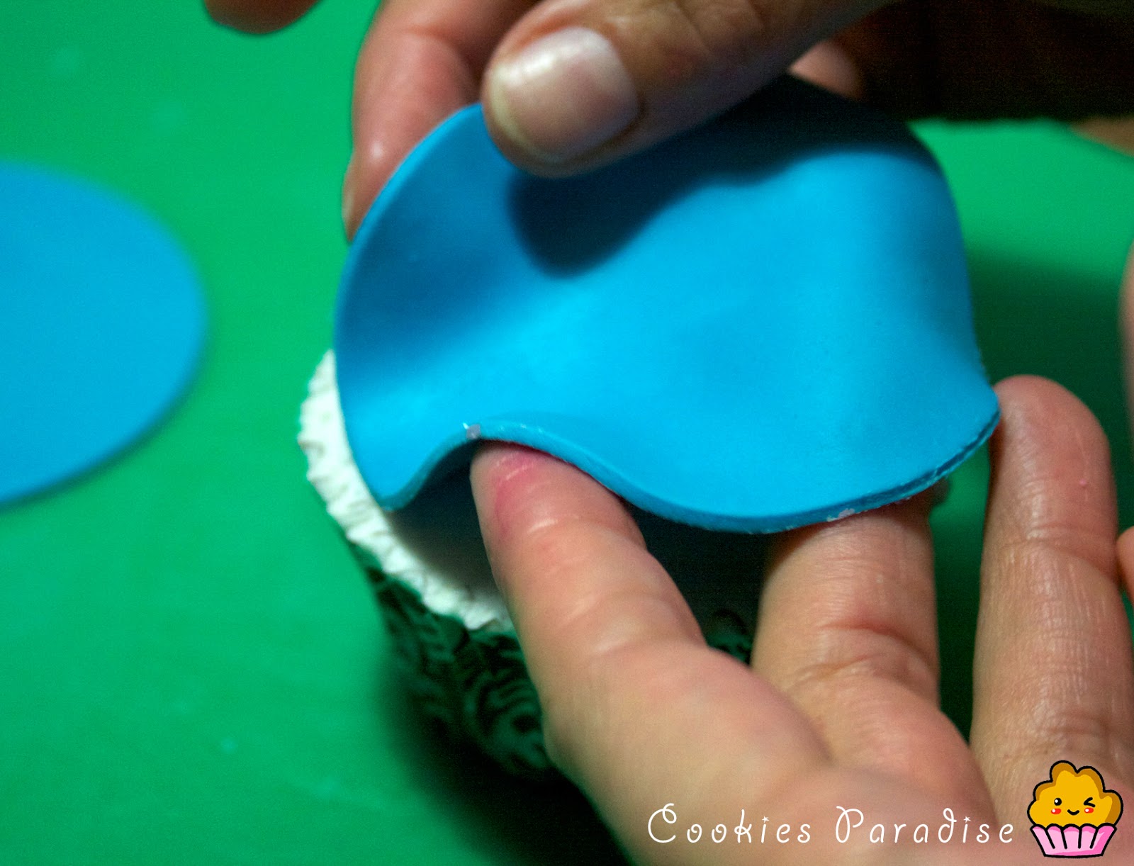 Con cuidado de no deformarlo, lo colocamos encima del cupcake y con la ayuda de las yemas de los dedos lo colocamos bien.