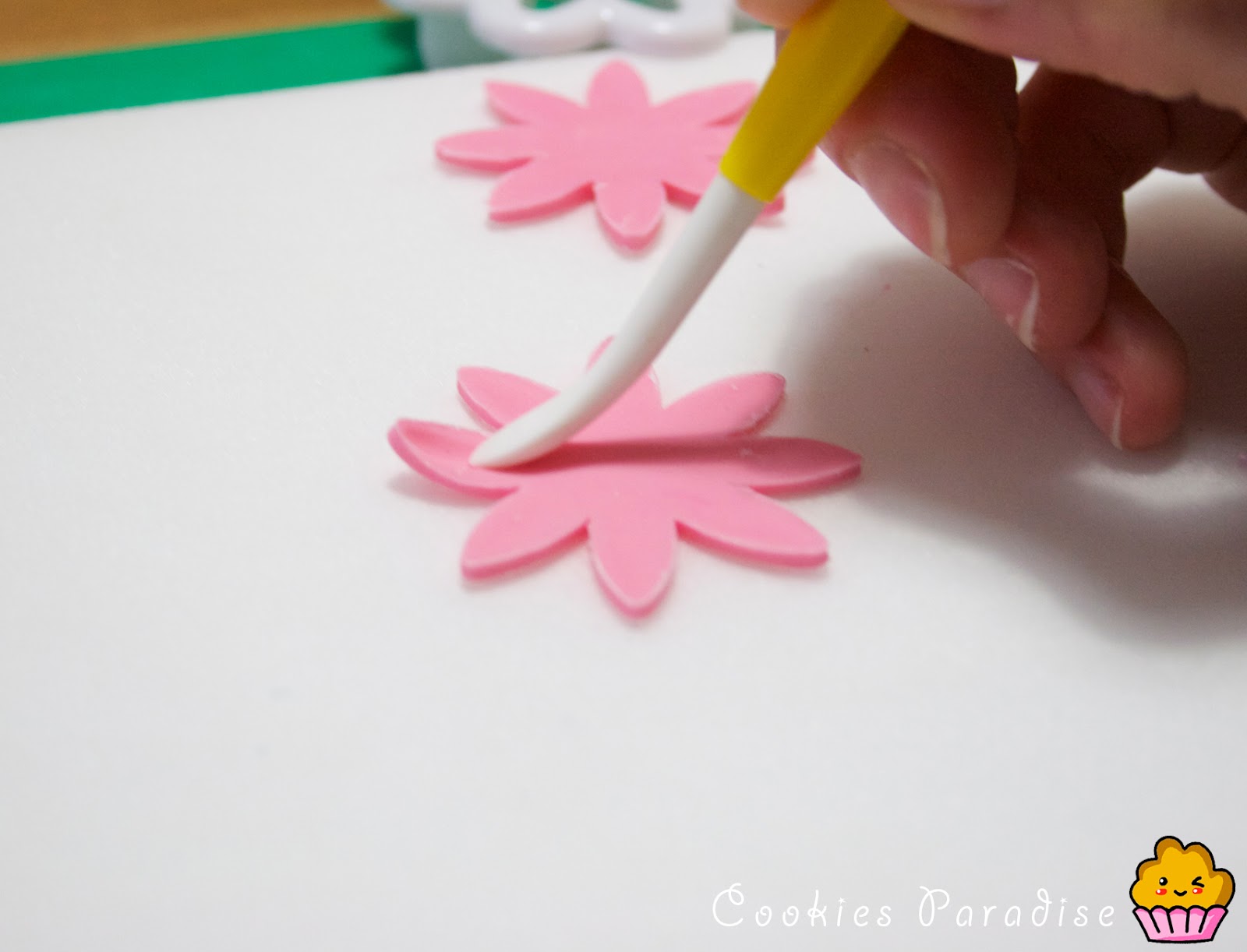 Con la ayuda de esta herramienta o la bolita presionamos suavemente cada pétalo hacia dentro para darle forma.