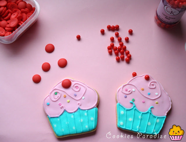 A mi me gusta más la de la guinda hecha con glasa, la del caramelo es más dura y al ser más pequeña no me gusta tanto, la de la glasa esta mucho más buena y además está blandita, puse recién pintada la galleta y tenía que haber esperado más por que veo que ha dejado un sombreado alrededor, pero me daba miedo que se secara demasiado y no se pegara, ¡las prisas son malas! …lo sé…..