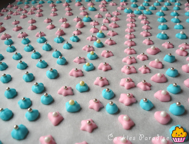 hola Gema G. Las florecillas están hechas con glasa, la misma glasa con las que he decorado las galletas. No se hornean, solo las tienes que dejar secar unas horas y guardarlas en un tapper.