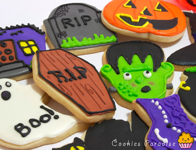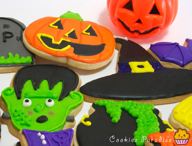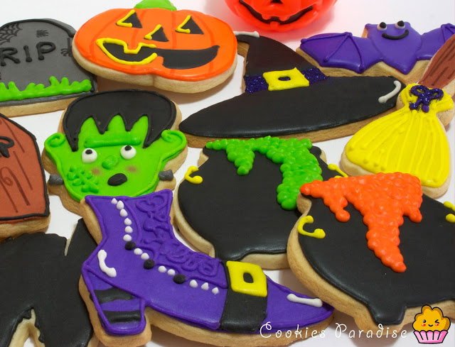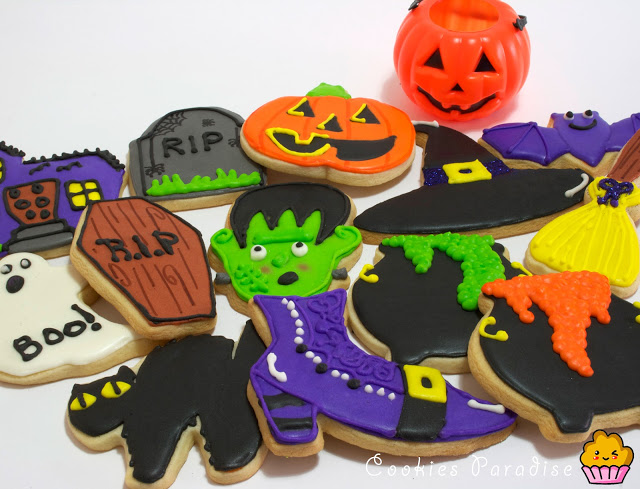 Halloween!! Halloween!! Truco o trato!! Me encantaaaaaa!! Me encanta!!! Desde que empecé con los cupcakes y galletas decoradas me moría de ganas de hacer estás galletas!! La mansión, la calabaza, frankenstein, el fantasma, el gato, el muerciélago, las tumbas, la caldera, la escoba, el zapato y sombrero de la bruja. Todos són tan guayssss!!