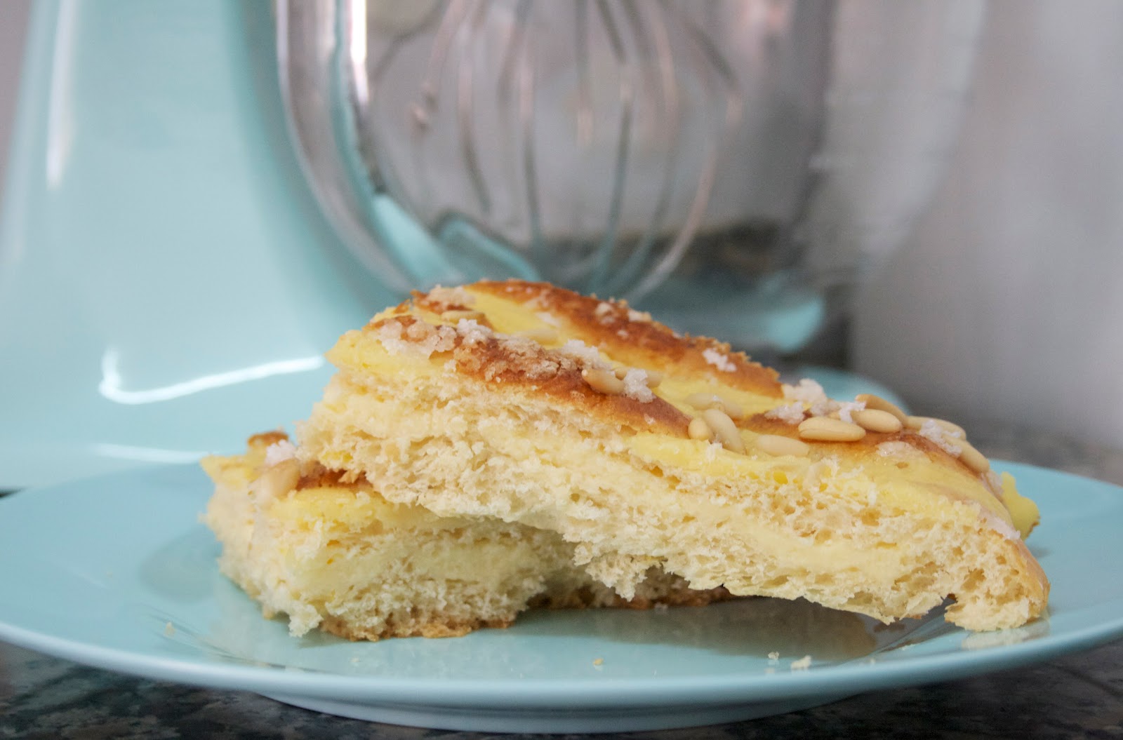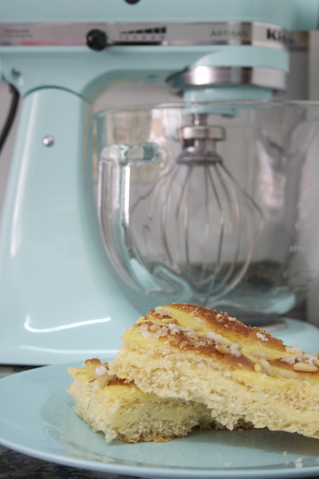 Aquí podeís ver mi coca recién hecha y acompañada de mi adorable Kitchenaid, (si os fijaís el plato es a conjunto….es de la marca Rice)