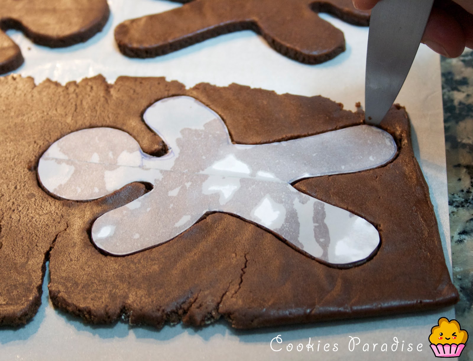 Como no me sirbió mi cortador de muñeco de jengibre…me tube que hacer un cortdor de emergencia, así que un dibujo, papel vegetal y tijeras….solo tenemos que recortar por alrededor con un cuchillo, si queda algo desigual luego lo arreglamos con la yema de los dedos.