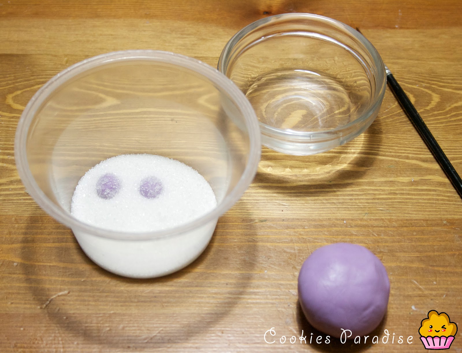 Las gominolas forman parte de la decoración de esta galleta, como no tenía….gominolas de emergencia! las hice con fondant coloreado lila, formé bolitas de 1/2 centimetro de diametro y las mojaba en agua y seguido las hundía en azúcar. Al sacarlas las apretaba suavemente con el dedo indice para simular la forma de la gominola^^
