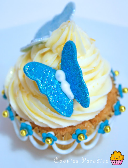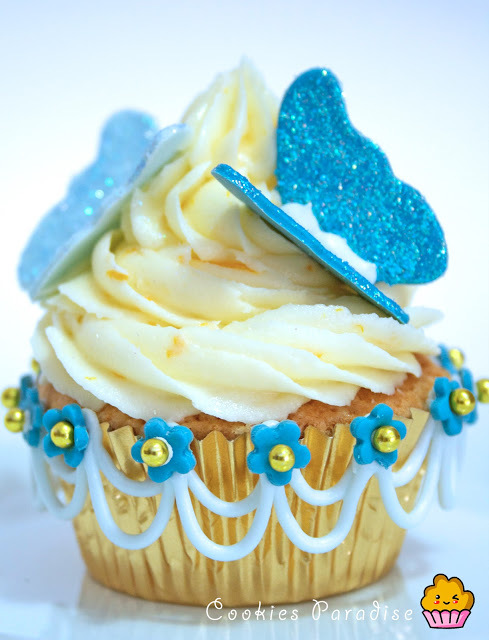 Ya solo nos queda poner el buttercream dentro de nuestra manga pastelera y decoramos en sentido a las agujas del reloj haciendo un circulo encima del otro en forma de montañita. Encima colocaremos nuestras mariposas y ya tenemos los cupcakes listos para comer!El Glaseado: