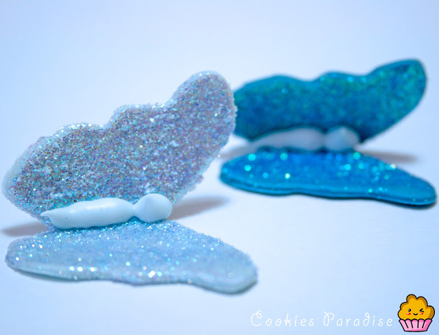 Una vez secas con la ayuda de un pincel humedecemos las mariposas y las pintamos con purpurina (yo recomeindo que la purpurina sea más clara que la mariposa) me gustá más el efecto final. Una vez que hemos puesto la purpurina hacemos el cuerpo de la mariposa, con la ayuda de una boquilla finita (wilton 3) y un poco de glasa, hacemo un circulo y despúes el cuerpo. Una vez secas del todo  las colocamos encima de nuestro cupcake 🙂