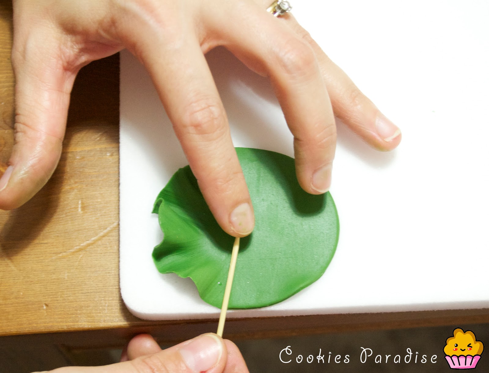 Lo que haremos será trabajar alrededor de cada círculo con un palillo, presionando suavemente rizando el fondant con cuidado de no romperlo, de este modo haremos nuestro árbol. Tenemos que poner el círculo al filo y trabajarlo con el palillo encima de una alfombrilla.