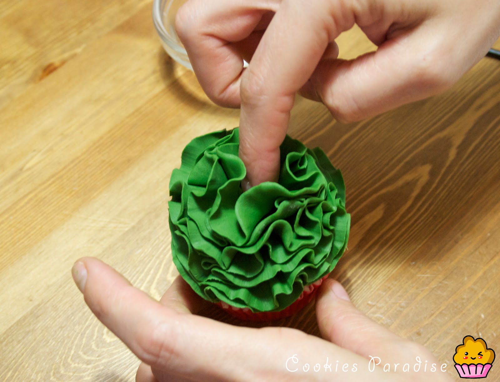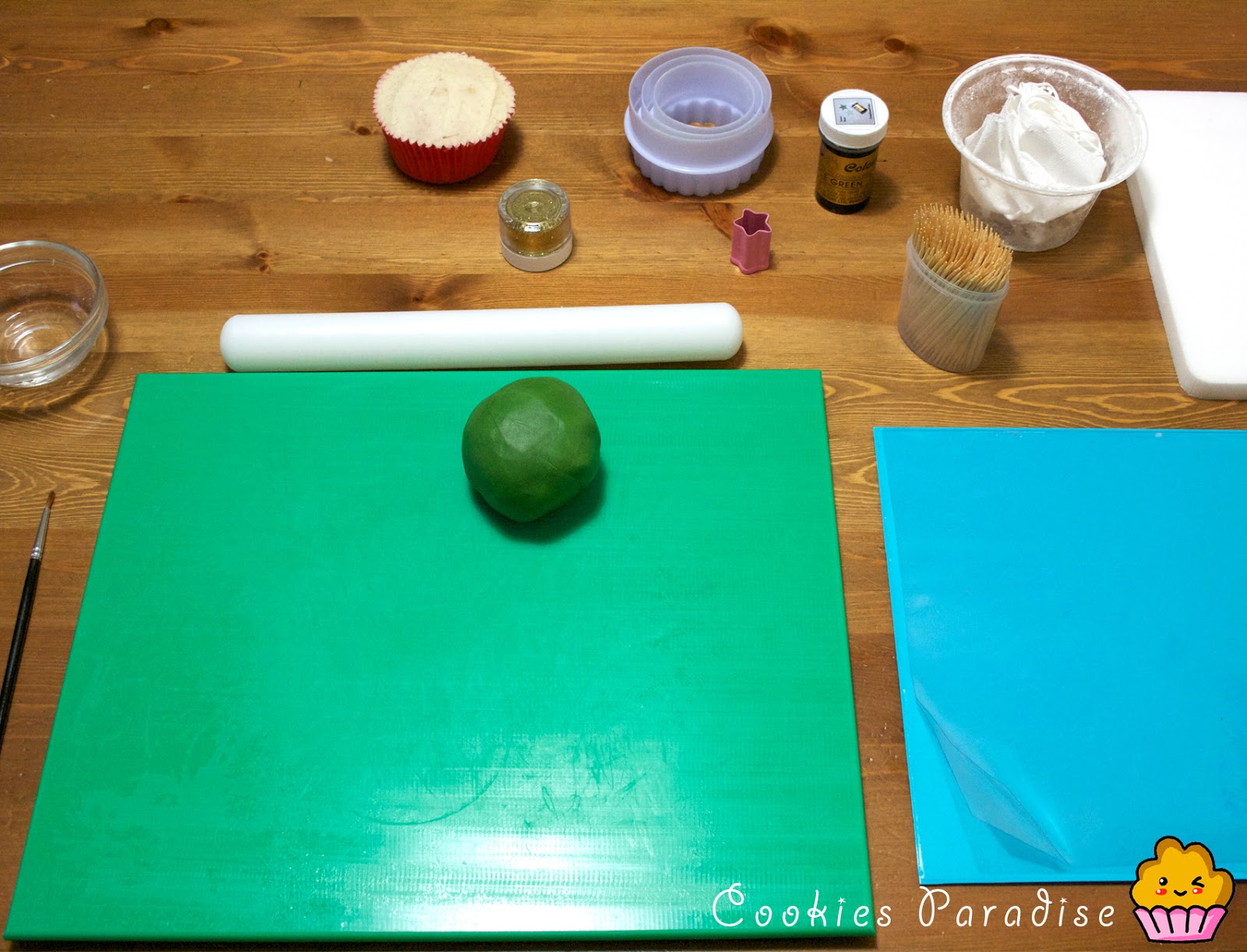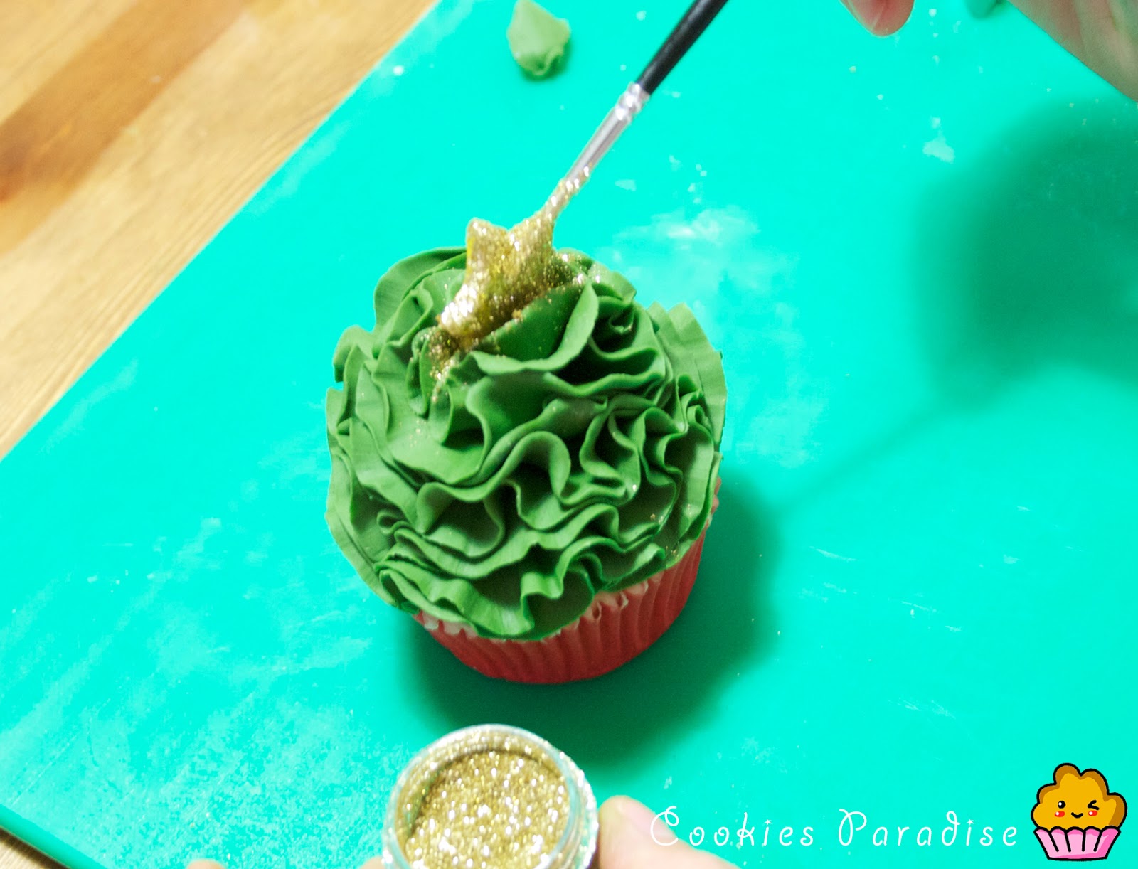 Necesitamos: Fondant verde y un poco de fondant amarillo para la estrella, 3 cortadores redondos: pequeño, mediano, grande, un cortador pequeño en forma de estrella, palillos para rizar el filo, pincel y agua, purpurina dorada (no tóxica) maicena, rodillo pequeño y una albombrilla . Y el Cupcake!!!