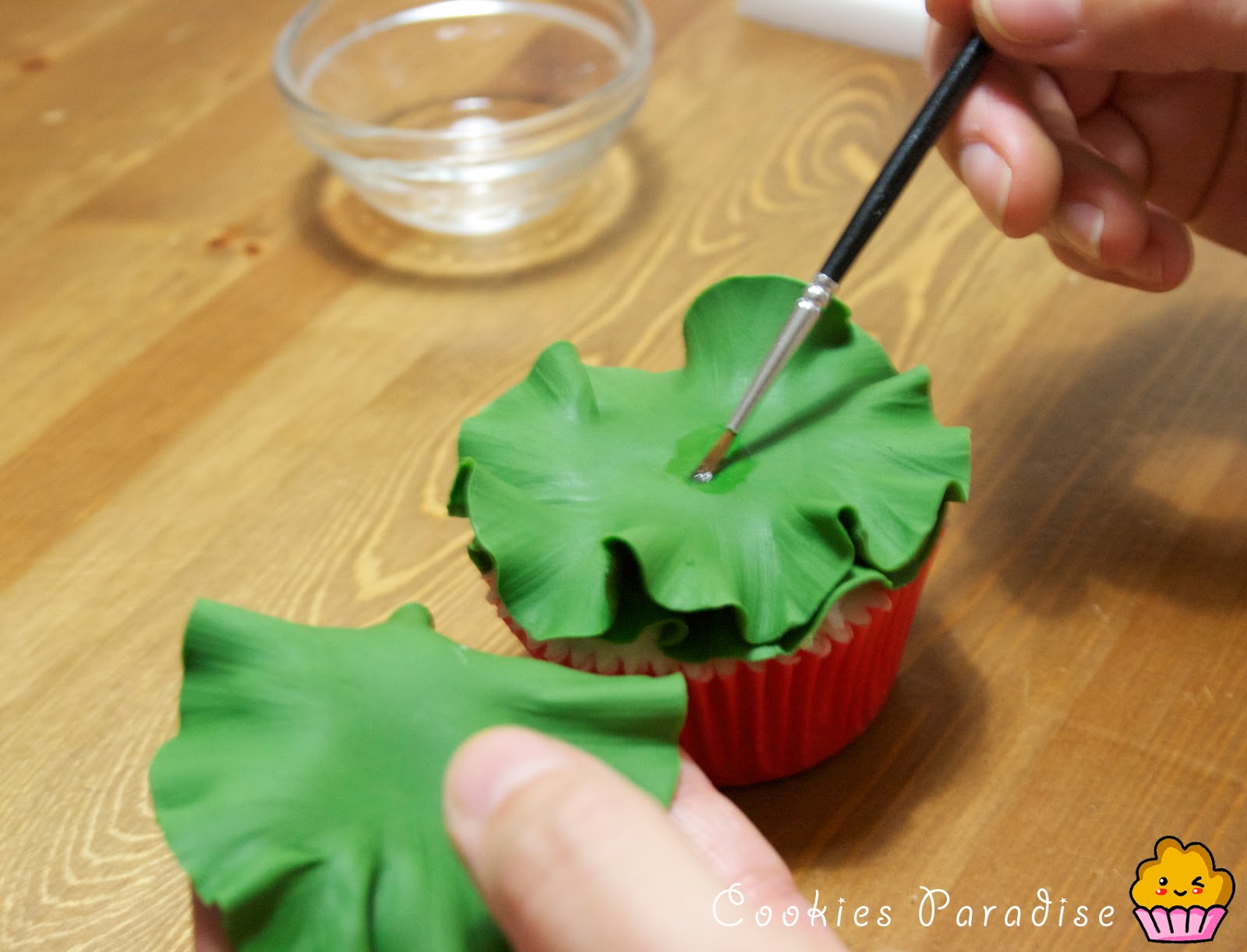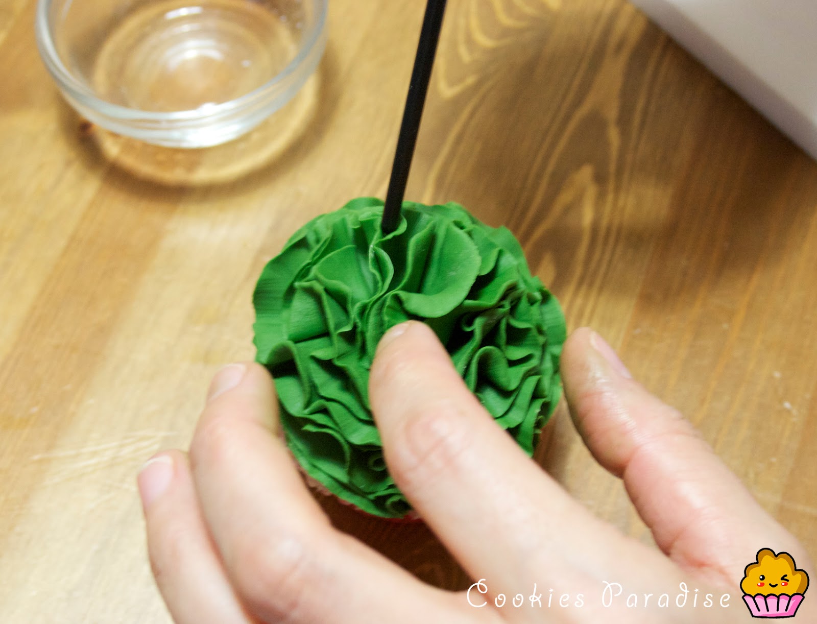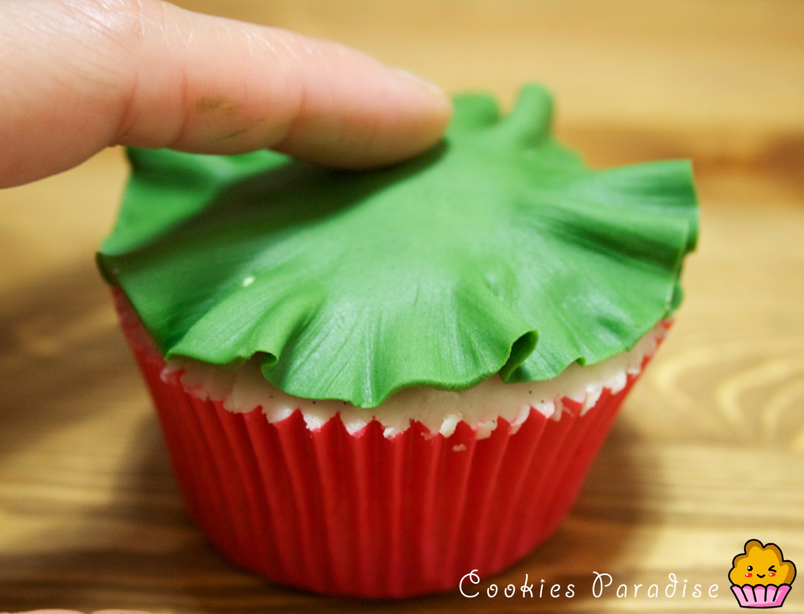 Necesitamos: Fondant verde y un poco de fondant amarillo para la estrella, 3 cortadores redondos: pequeño, mediano, grande, un cortador pequeño en forma de estrella, palillos para rizar el filo, pincel y agua, purpurina dorada (no tóxica) maicena, rodillo pequeño y una albombrilla . Y el Cupcake!!!