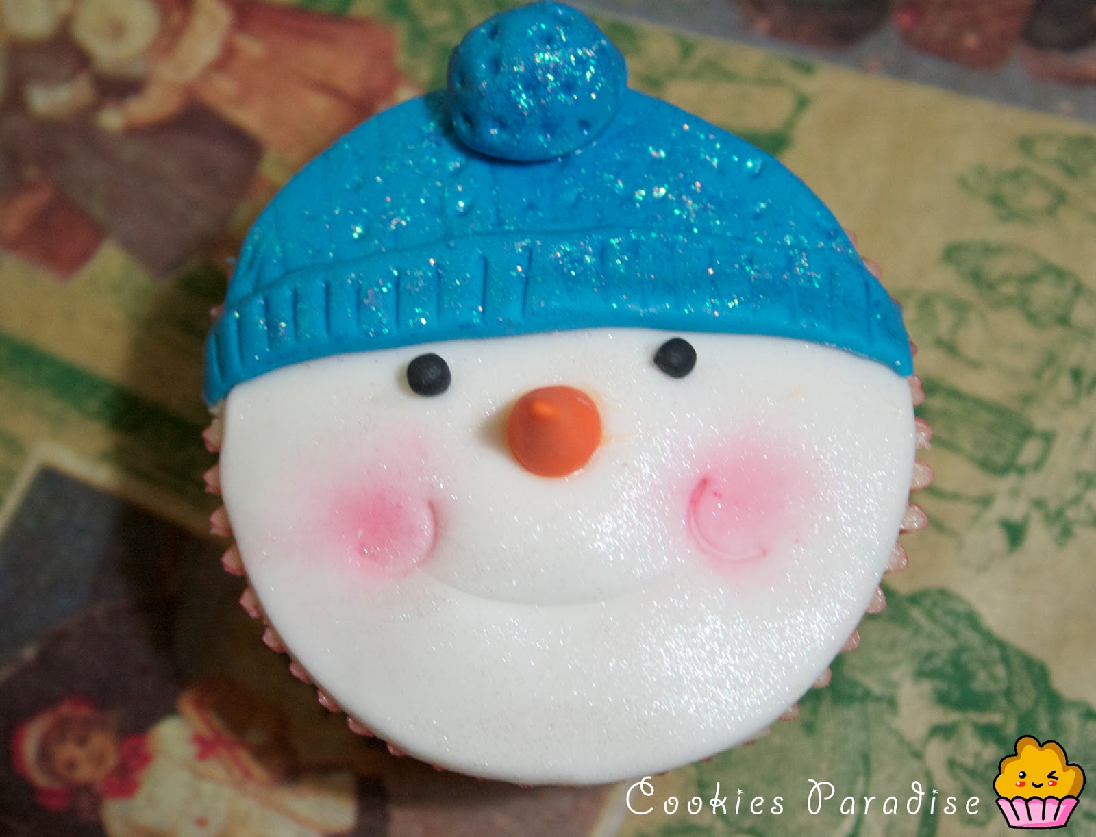 El muñeco de nieve es muy fácil, primero hacéis un círculo con fondant blanco, hacemos el gorrito con el color que nos guste, en este caso azul. Hacemos un circulo, lo cortamos por la mitad, doblamos un poco y con una herramienta simulamos como si fuera de lana, hacemos una bola y la pegamos con agua, hacemos la nariz en naranja en forma de cono y pintamos los coloretes con color en polvo yo he usado color coral de Sugarflair, mezclado con maicena para suavizar el tono.