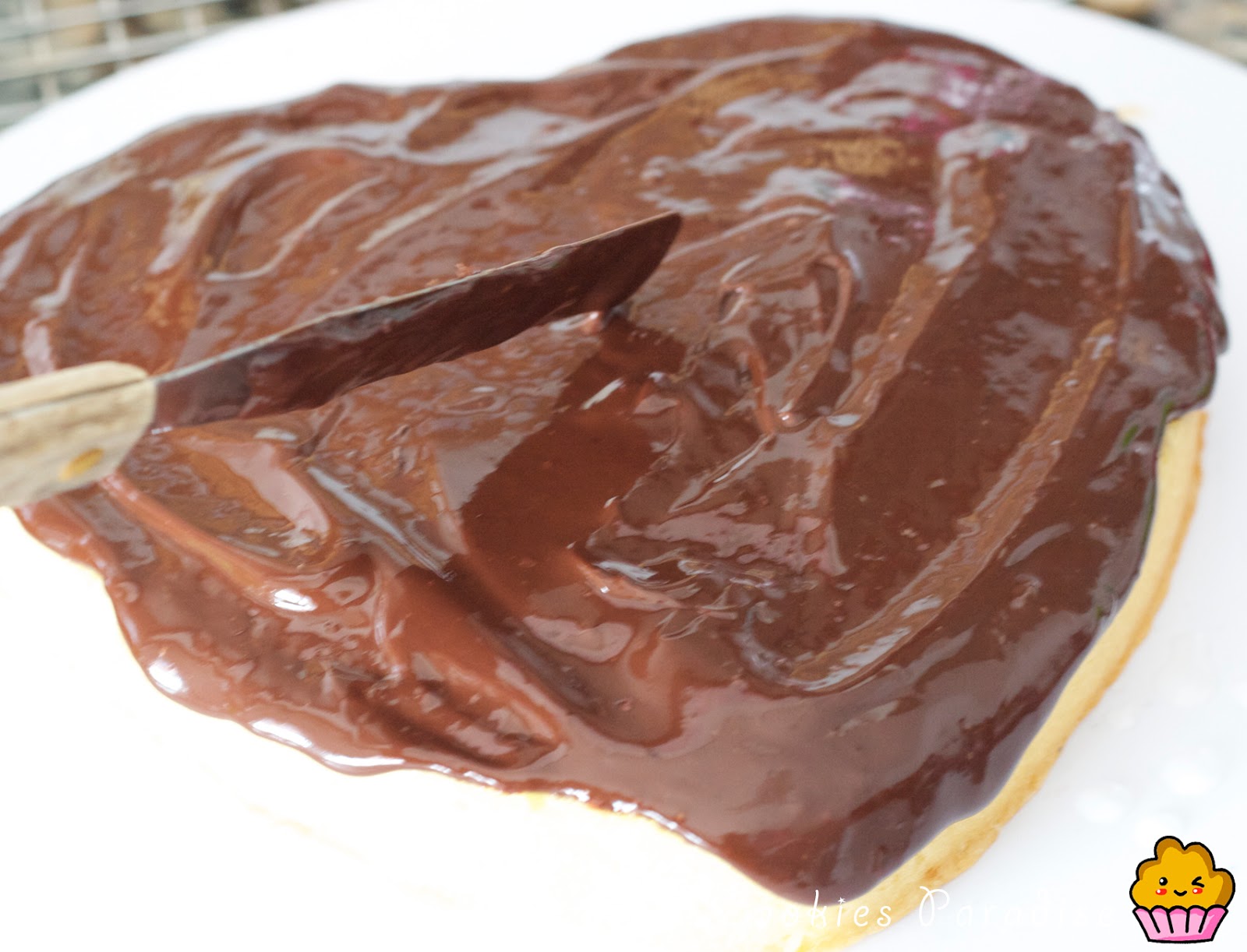 Cubrimos con la segunda capa y pintamos alrededor en este caso con ganache de chocolate.