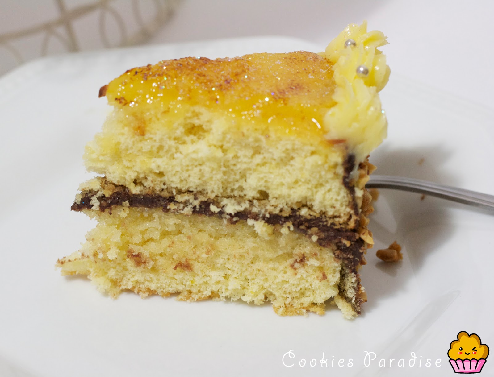 Hoy os traigo una receta básica de un bizcocho genovés, relleno de ganache de chocolate y cubierto de yema quemada, todo un clásico verdad?
