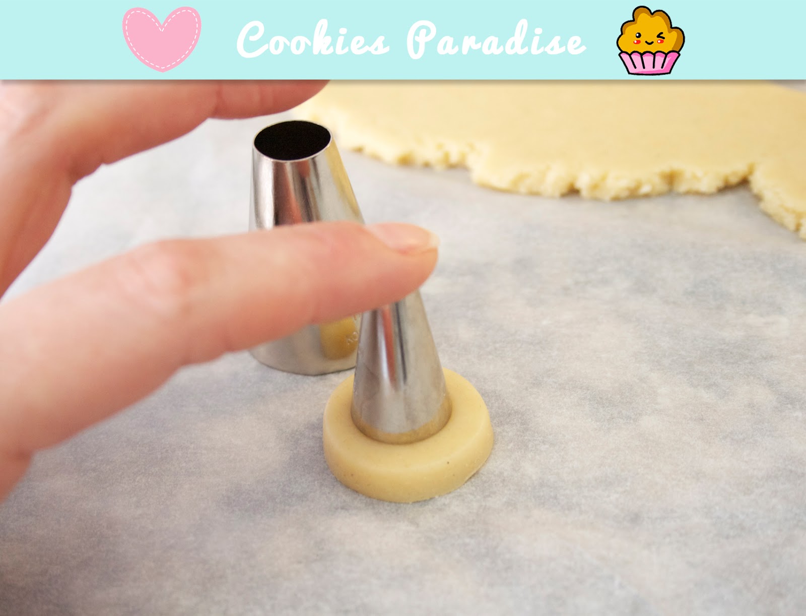 Con un cortador de un diametro de 3 centimetros aprox cortamos un círculo, yo he utilizado una boquilla grande, si la masa se queda pegada y no sale podeis empujarla un poco desde dentro hacia fuera con la ayuda de un bolillo redondo.