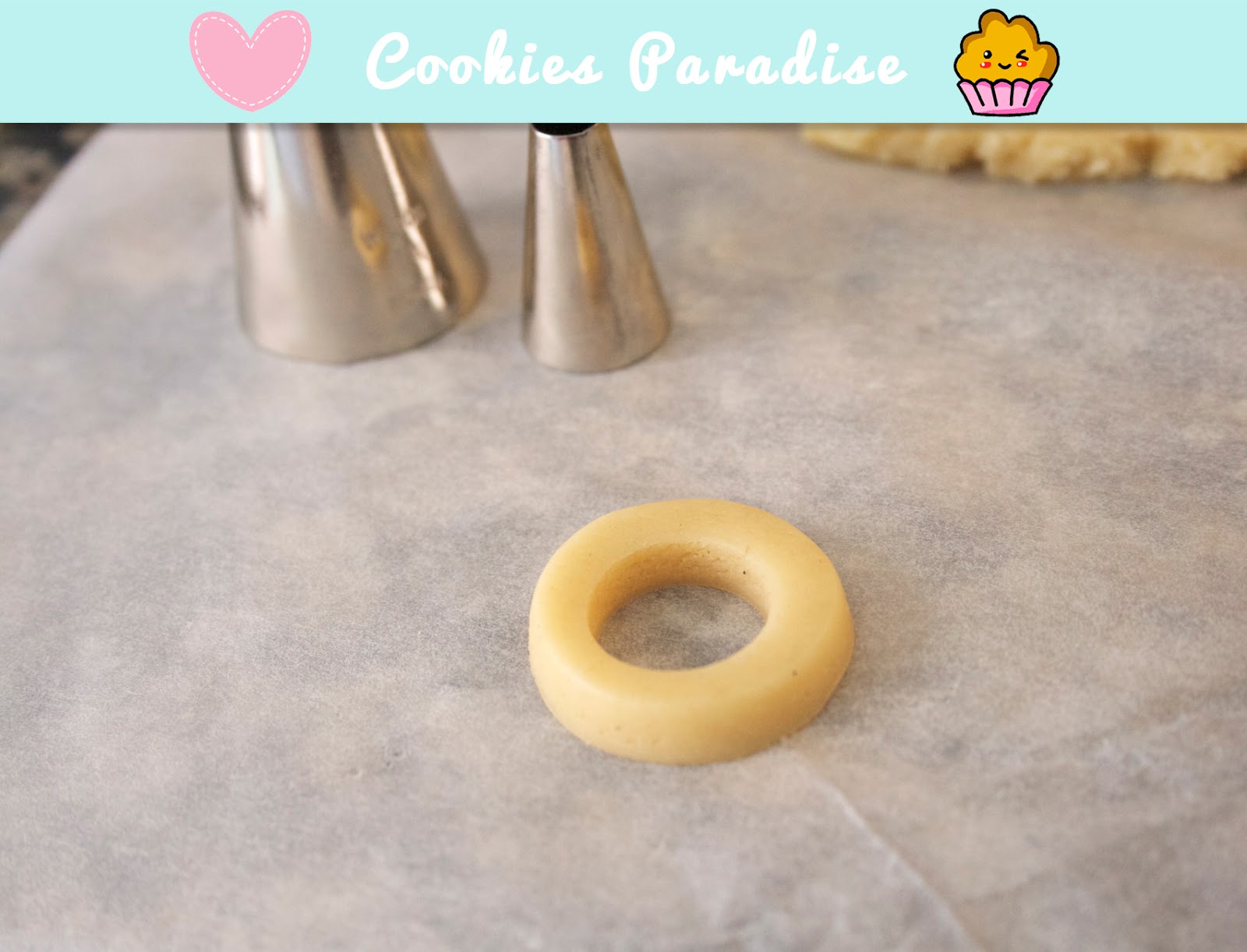 Nos tiene que quedar algo parecido a un aro, la masa tiene que estar fría para que quede perfecto y no se deforme al cojerlo, bastará con dejar enfriar la masa de galletas 1hora en la nevera.