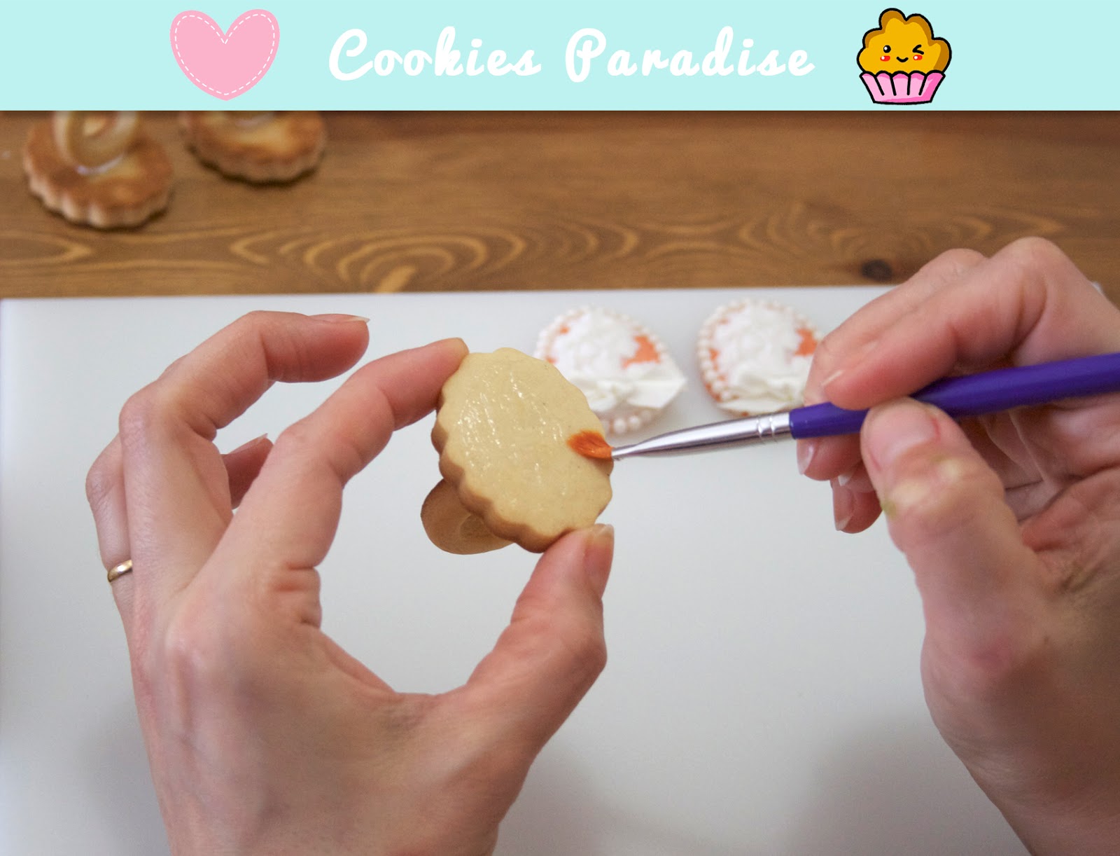 Cuando la glasa se haya secado, ya podemos continuar. Con un pincel, pintamos la parte superior de la galleta ovalada con un poco de agua (yo he utilizado pipping gel)