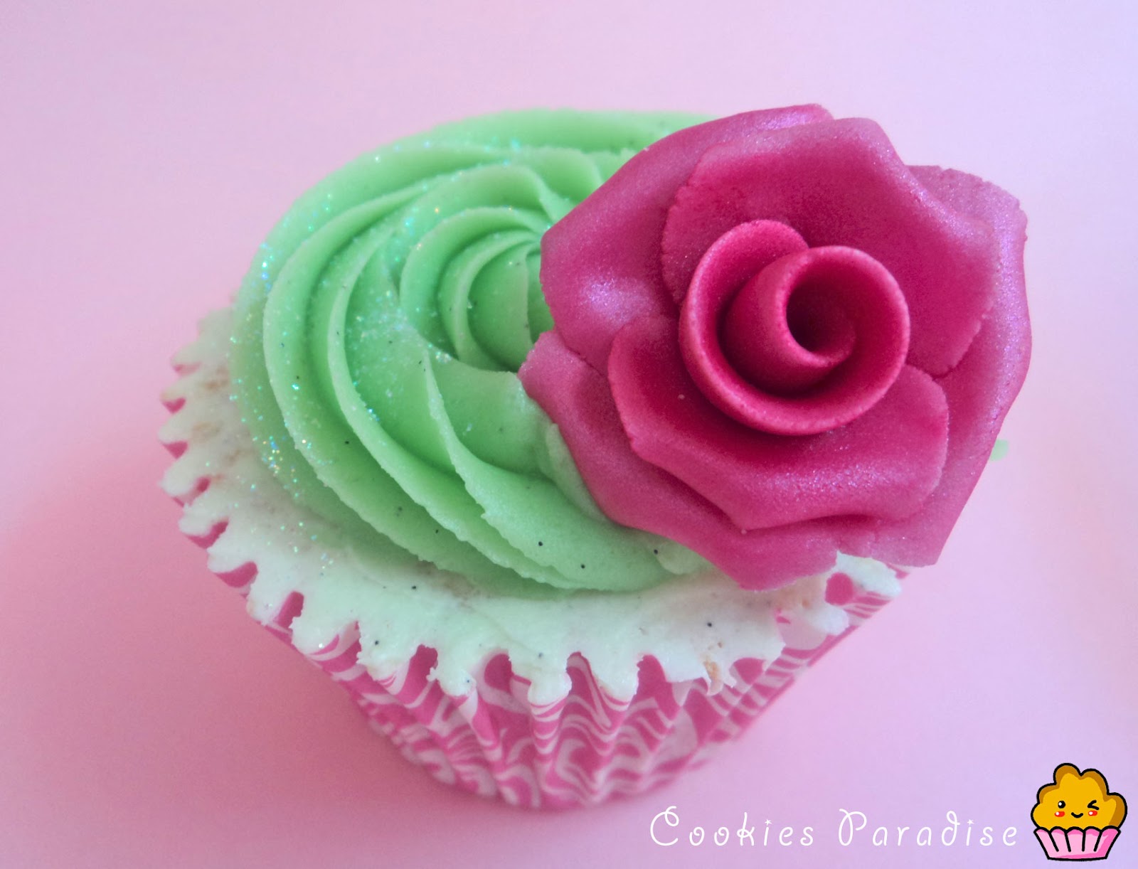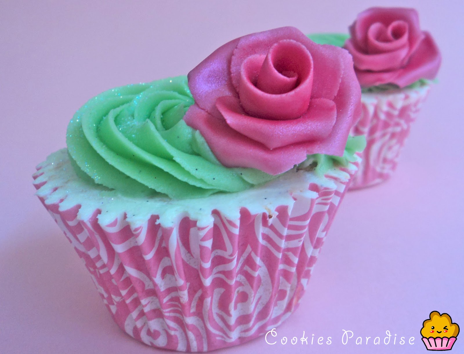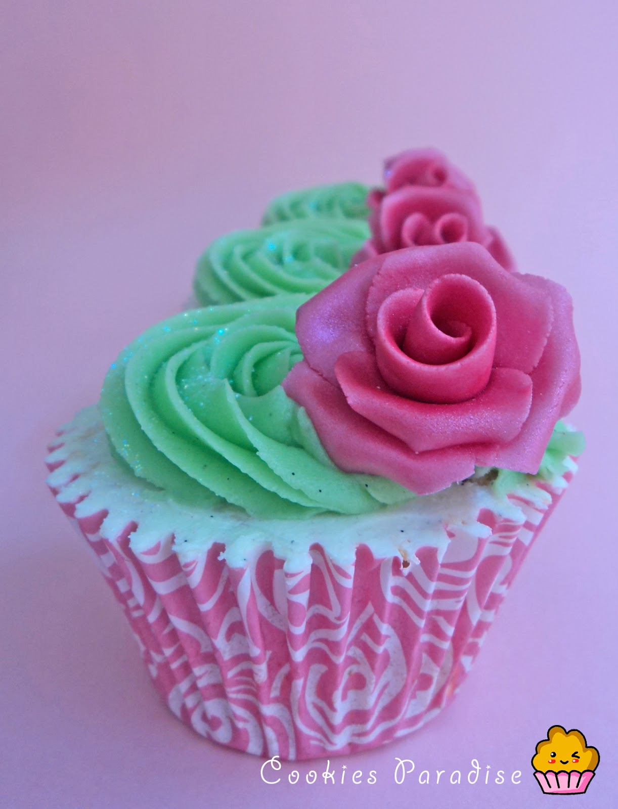 Una vez que hice las rosas, las pinte con luster dust color raspberry para darles brillo, cuando las rosas ya estaban secas, hice el butercream de vainilla le puse colorante verde de americolor, con la boquilla 2c de wilton decoré los cupcakes, espolvoree un poco de purpurina encima y coloqué mis rositas encima! Os gustan? ha sido un fín de semana exitoso en la cocina, estoy muy contenta, besos!