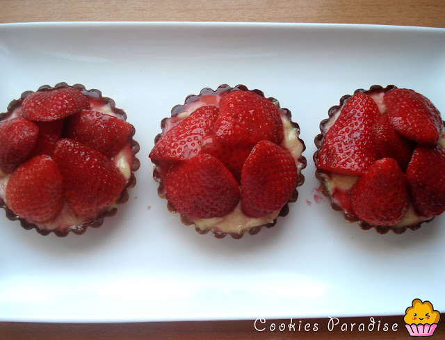 Separamos un poco de leche en una taza para deshacer la maicena, ponemos a hervir el resto de la leche con el azúcar, la cáscara de limón, la vainilla y la cánela, lo dejamos hervir unos 5 min. En un vol ponemos las yemas, la maicena y la leche fría que reservamos y lo mezclamos bien, añadimos esta mezcla pasados los 5 min a la leche hirviendo y lo removemos con las varillas unos 5 min más a fuego lento hasta que espese, retiramos la canela y la piel del limón y si hubieramos puesto vaina de vainilla y ponemos la crema en un vol de cristal (así enfriará antes) y la cubrimos con film transparente (con esto esvitamos que se seque la parte de arriba) Cuando esté fría rellenamos los moldes (yo lo he hecho con una espatula de las galletas) pero podemos hacerlo con una boquilla lisa y una manga pastelera. Lavamos y cortamos las fresas a nuestro gusto, las secamos con un paño y decoramos las tartaletas, por último las pintamos con un poco de gelatina de fresa (opcional)