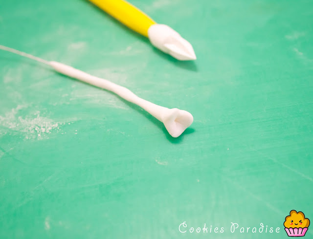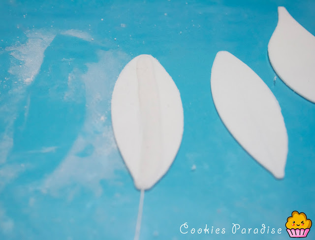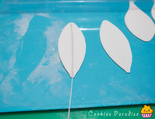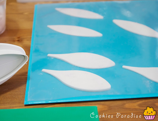 Alisamos con el rodillo la goma en pasta hasta que quede finita, espolvoreando maicena encima de la tabla para facilitar el movimiento con el cortador/expulsor, he utilizado los cortadores expulsores PME de lirium cortaremos 3 hojitas de cada, terminar de alisar el borde de la hoja con los dedos. Las reservamos debajo de un plástico para que no se sequen.