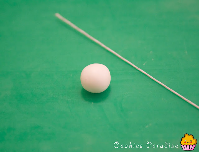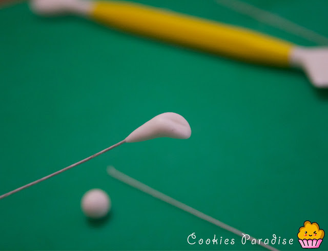 Ahora vamos a hacer 6 anteras , hacemos bolitas super pequeñas, mojamos la punta del estambre en el pegamento y clavamos la bolitas hasta la mitad, entonces deslizando el dedo hacia arriba formamos una gota, la curvamos hacia atrás y aplastamos suavemente. Le marcamos una línea pequeñita.