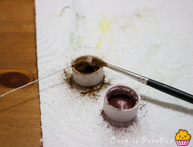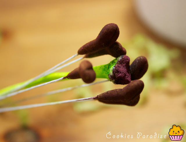 Una vez secas preparamos los colores, para el estigma utilice verde lima y amarillo, después he introducido la parte superior en el pegamento y luego lo he hundido en el colorante en polvo granate (simulando el polen). Para pintar las anteras elegí marrón y granate también.