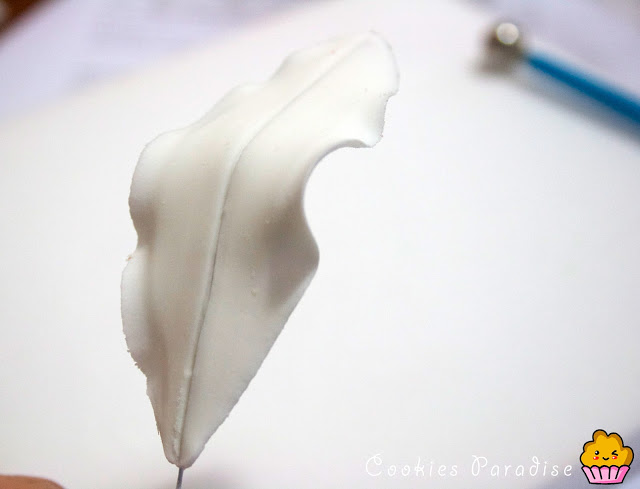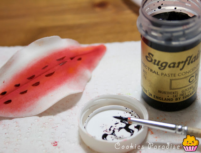 Ahora pintaremos los piquitossss!! Me encantan!! Lo podéis hacer con rotuladores comestibles, yo he utilizado colorante sugarflair marrón mezclado con pegamento comestible, hacemos las manchitas empezando de abajo hasta un poco más del centro de la hoja.